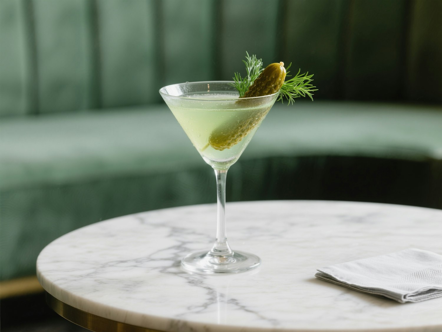 A refreshing green cocktail in a martini glass, garnished with a pickle and dill, on a marble table with a green background.