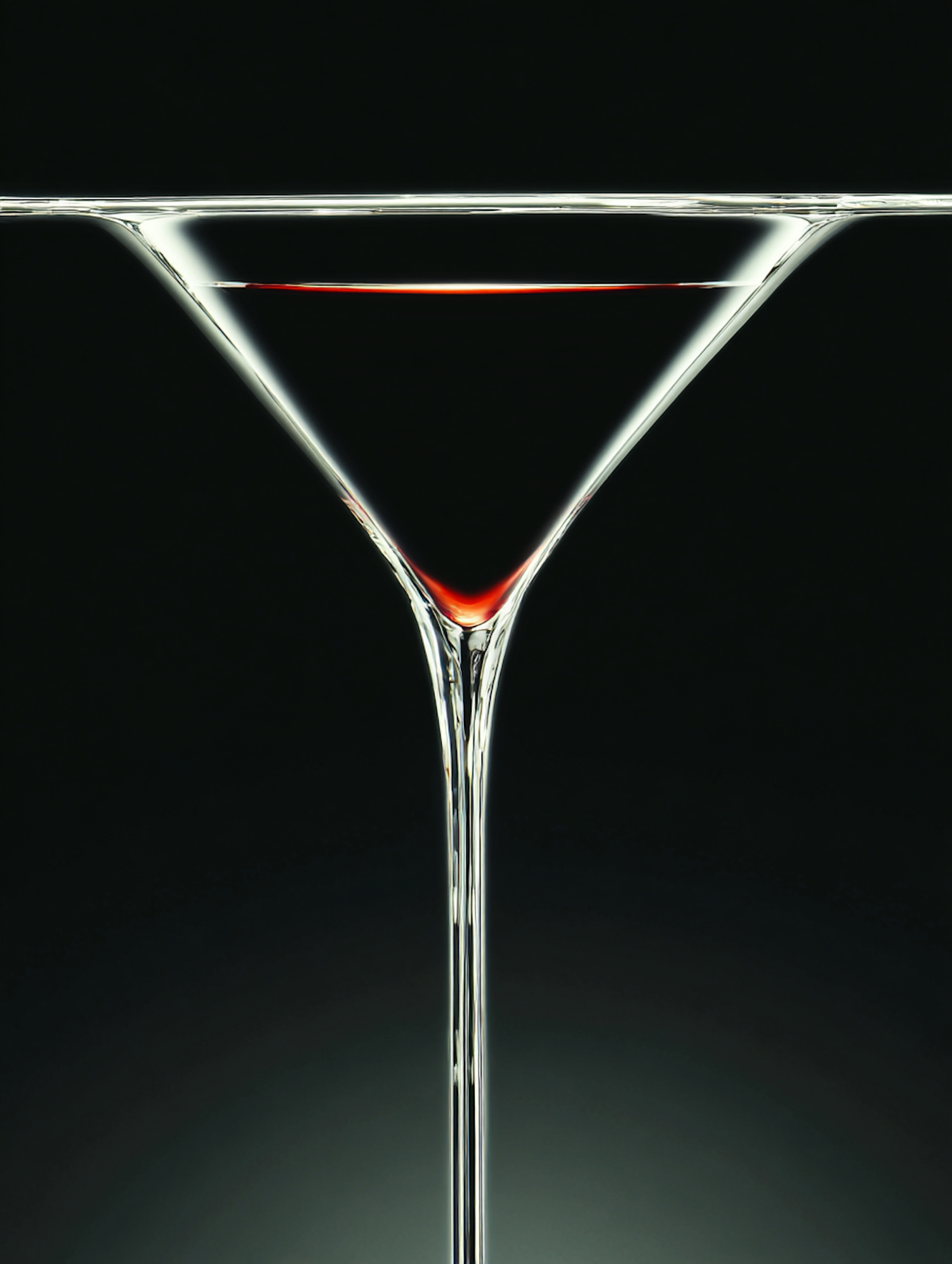 Minimalist close-up of a martini glass with red liquid, set against a dark background, showcasing elegance and simplicity.
