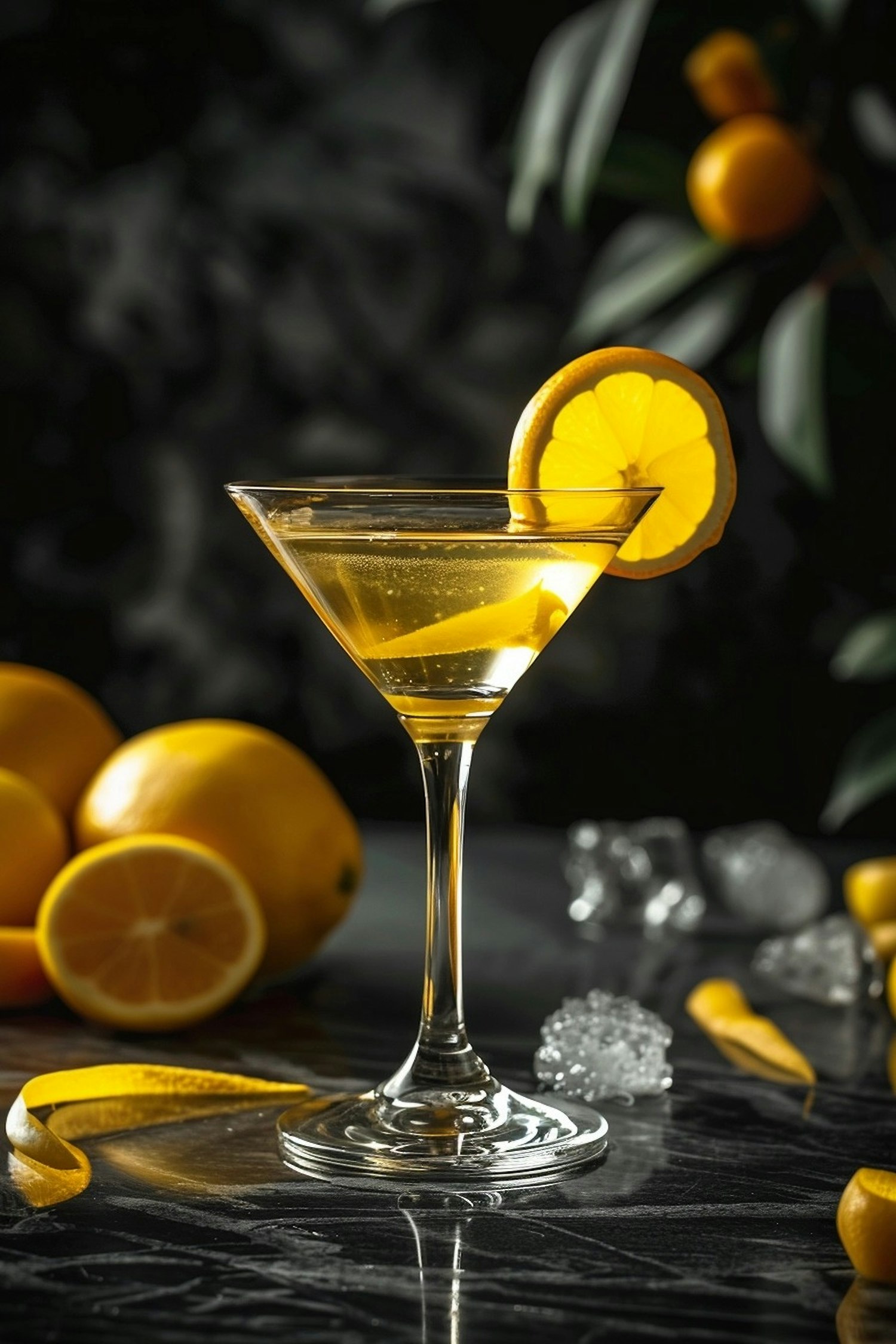 Elegant martini glass with lemon cocktail, garnished with a lemon slice, surrounded by fresh lemons and ice on a dark surface.