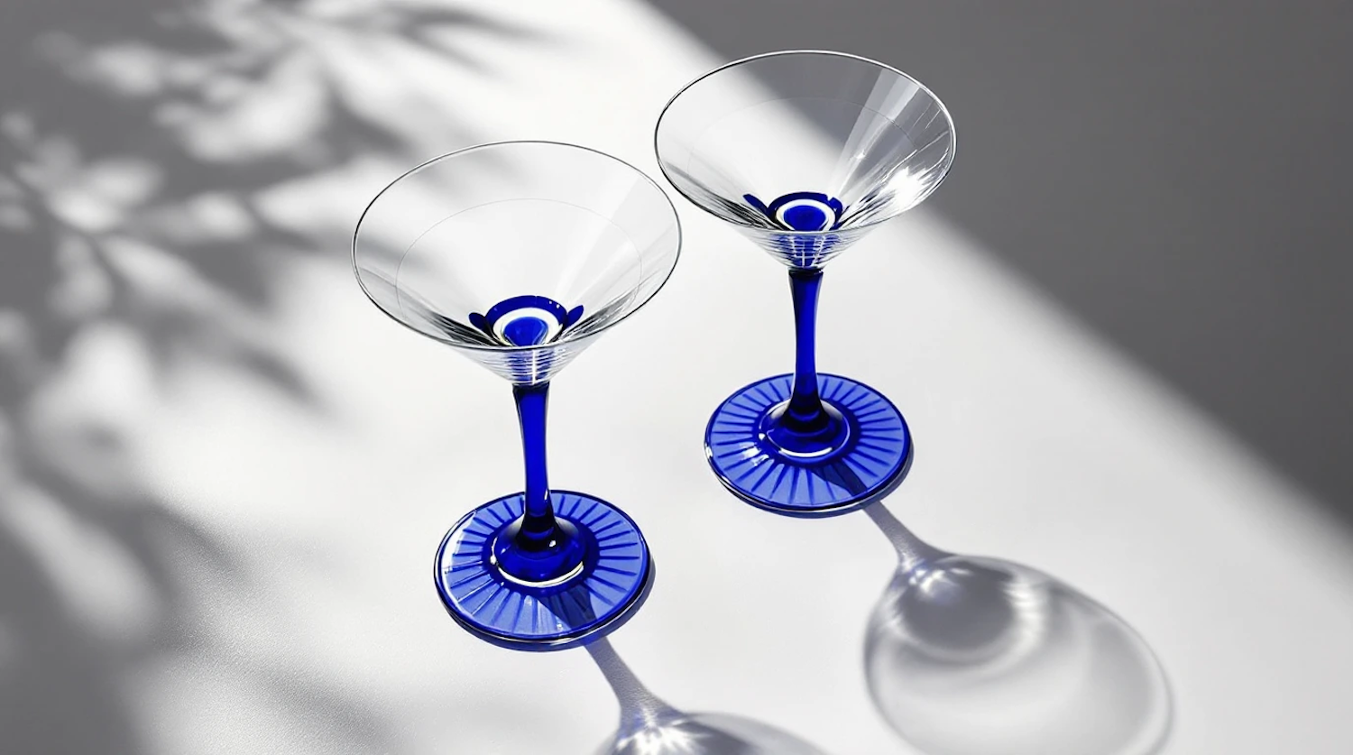 Elegant martini glasses with cobalt blue stems and bases, casting artistic shadows on a light surface.