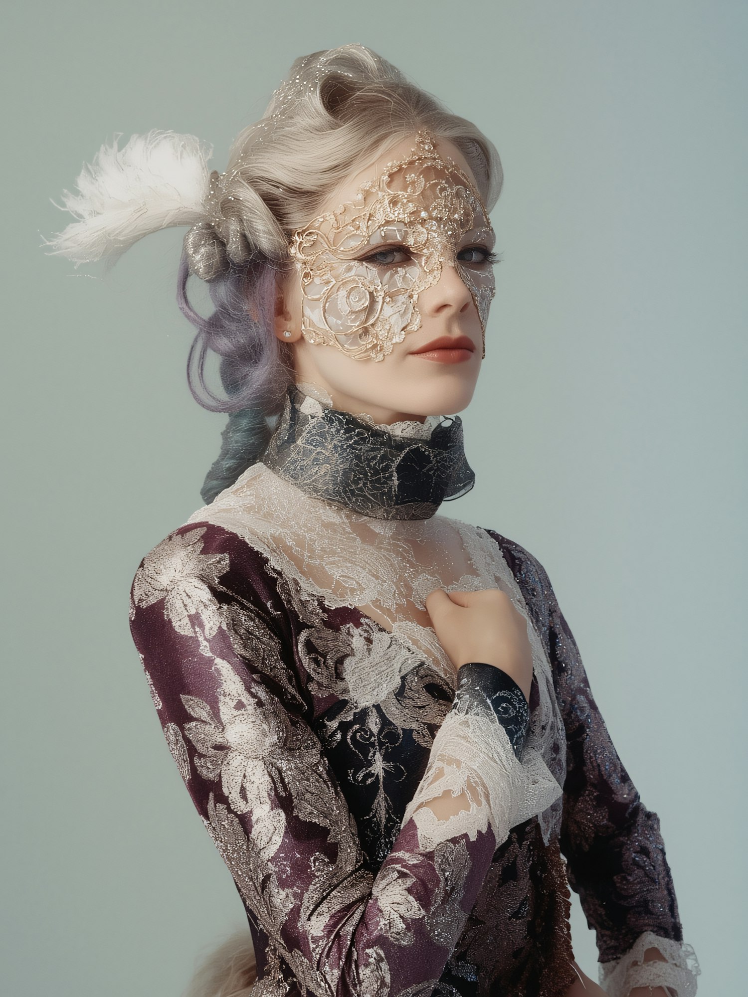 A person in an ornate purple and silver outfit with a golden lace mask and feathered hair accessory, exuding elegance and mystery.