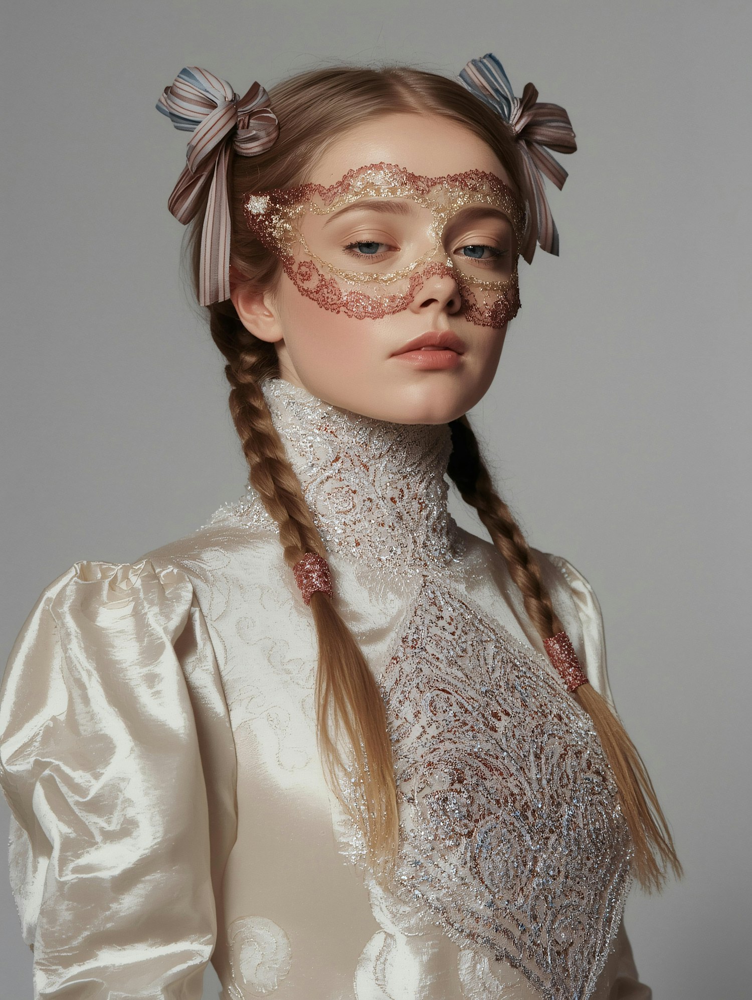 A young woman in a vintage cream dress and lace mask, with braided hair tied with ribbons, posing against a neutral background.