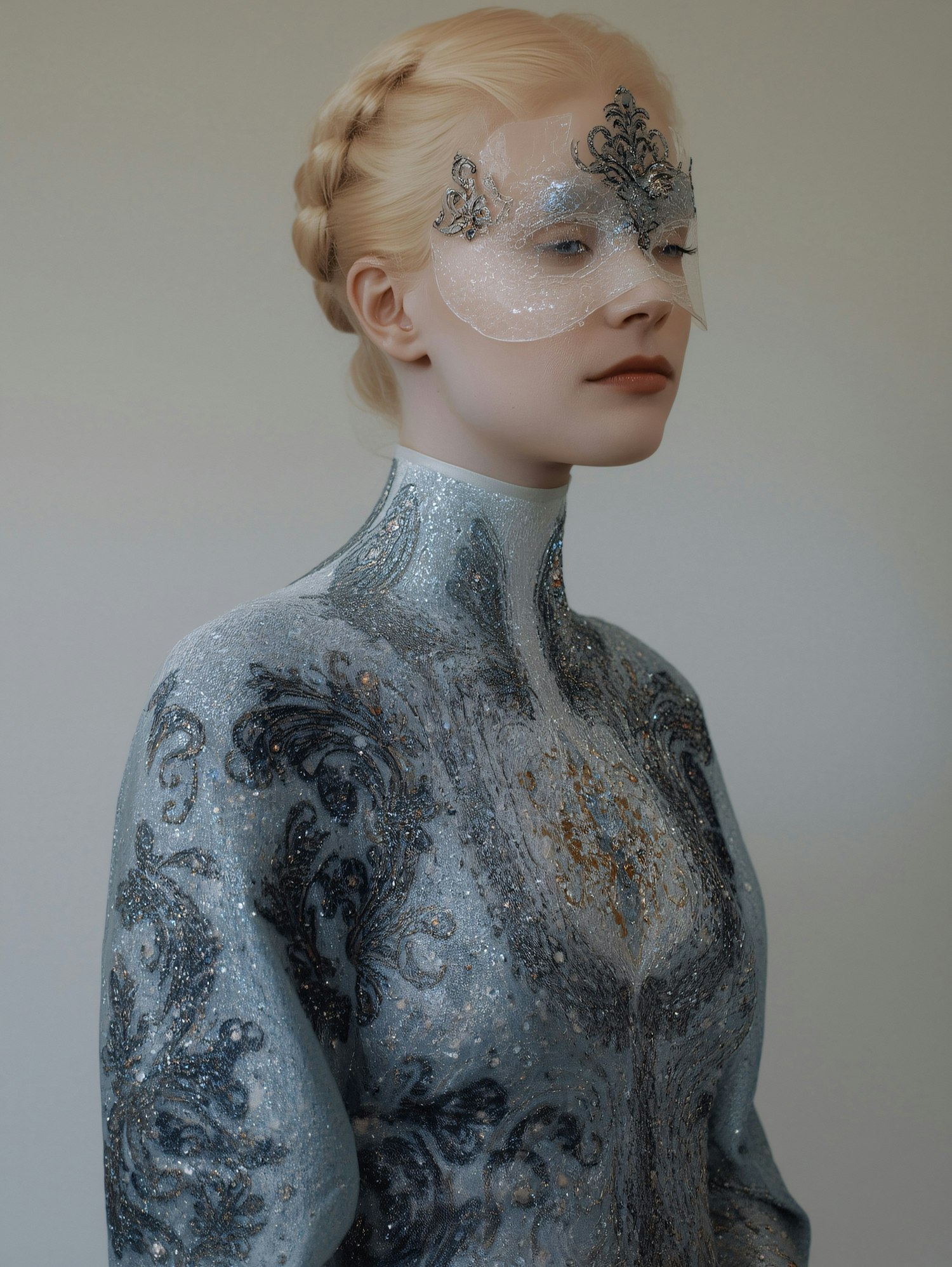 A person in an ornate, shimmering outfit with a decorative mask, exuding elegance and mystery against a neutral background.