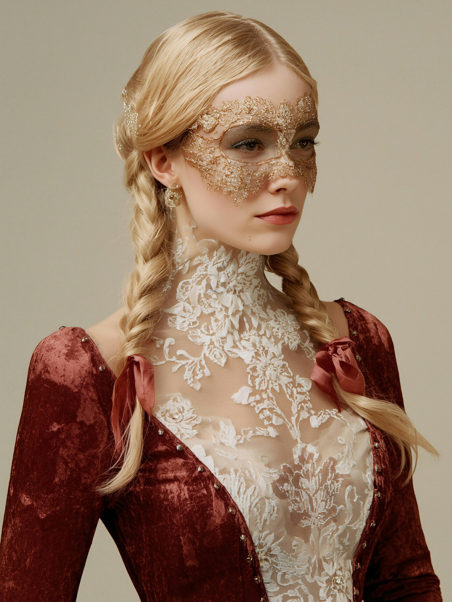 A woman in a burgundy velvet dress with lace details and a golden mask, styled with braided hair and ribbon accents.