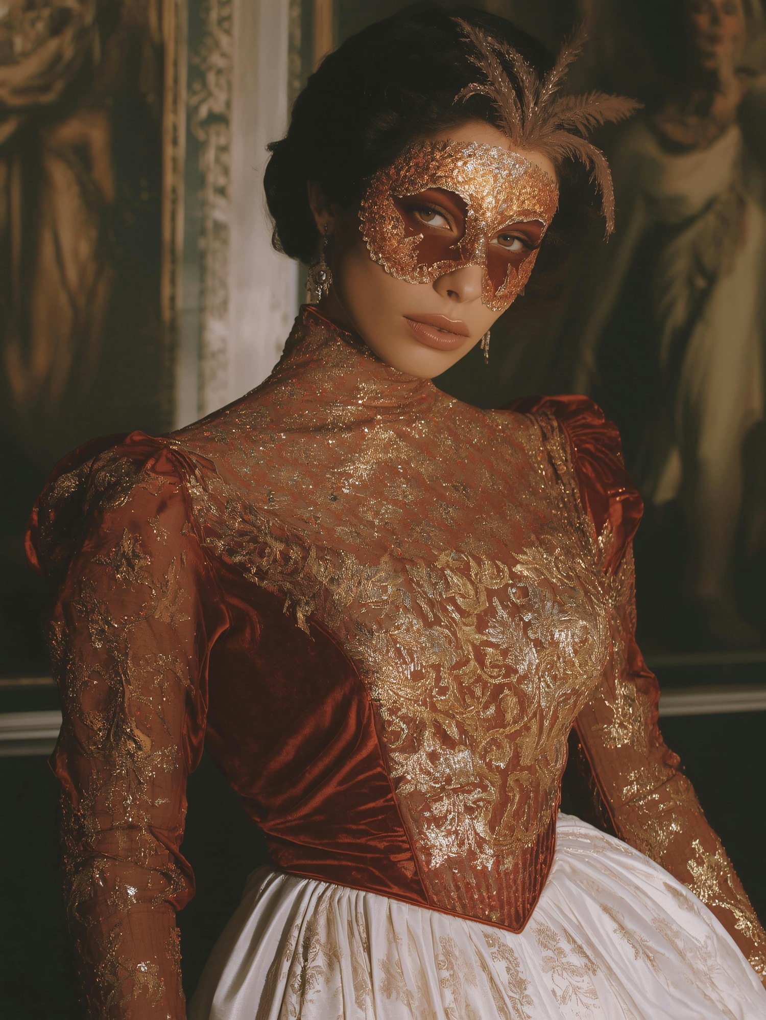 A woman in a red and gold brocade costume with a decorative mask and feather details, set against a dimly lit classical background.