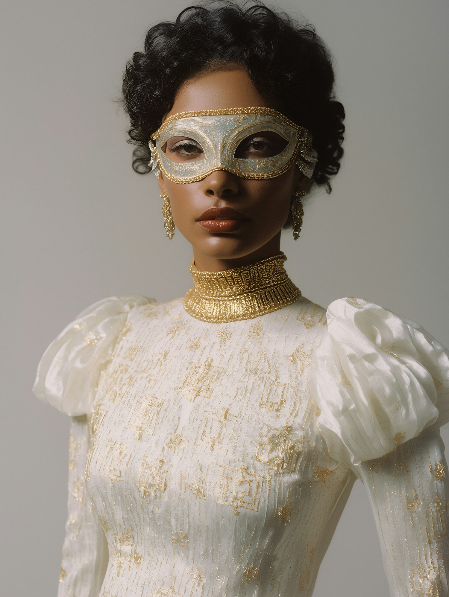 A woman in a white and gold embroidered dress with a golden mask and jewelry, exuding elegance and mystery against a neutral backdrop.