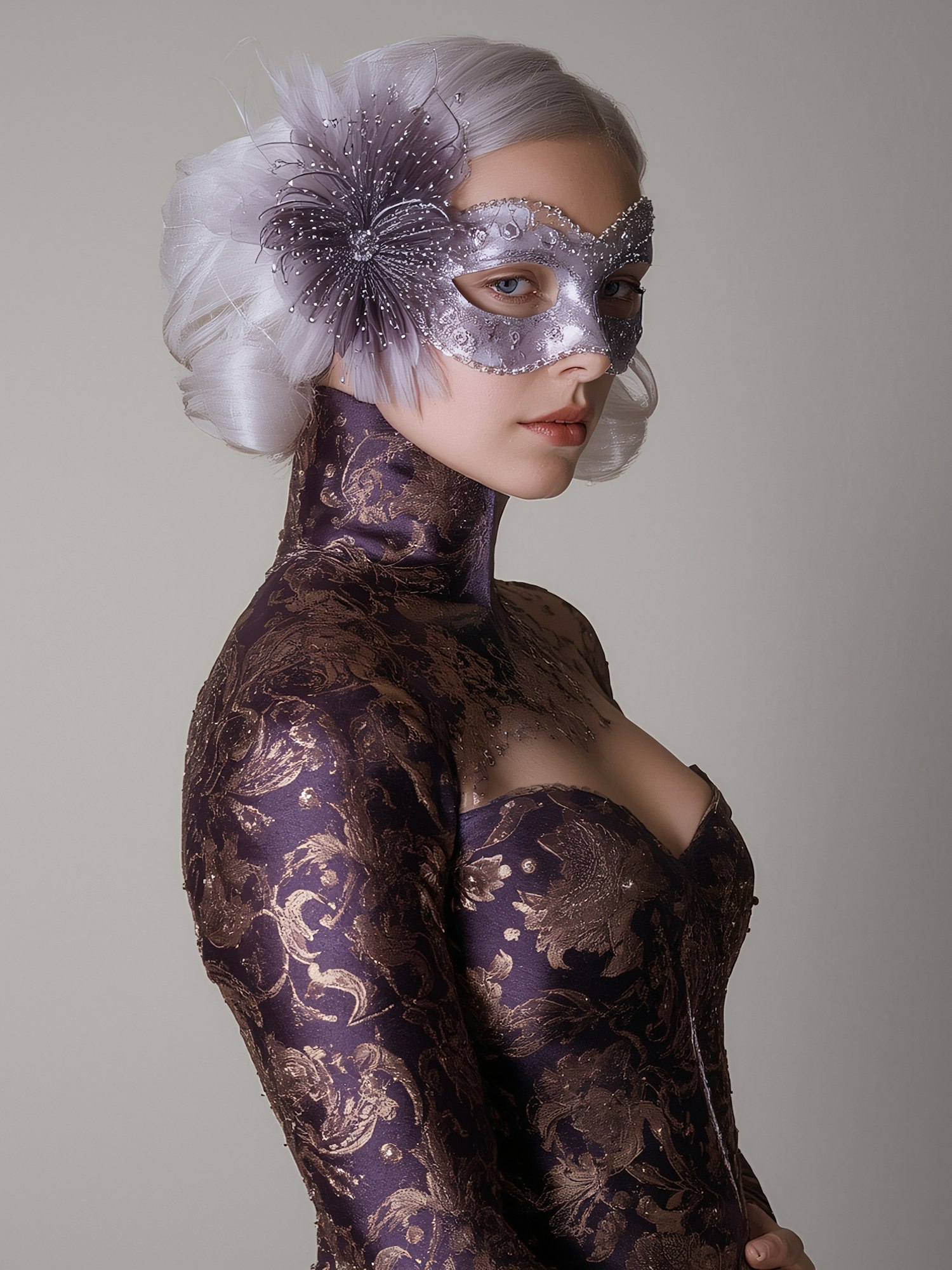 Elegant woman in a purple and gold brocade gown with a silver masquerade mask, exuding sophistication and mystery.