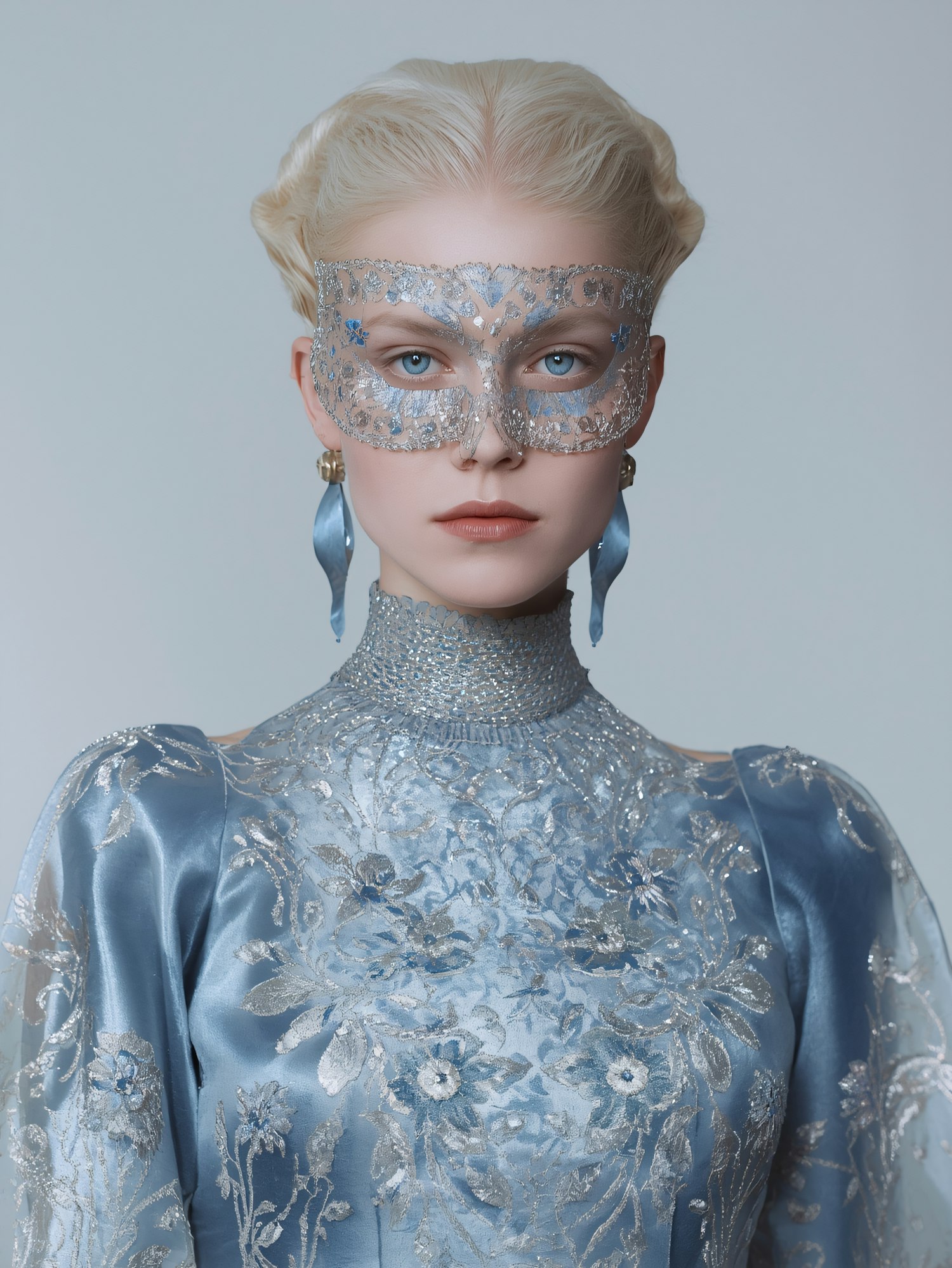 A woman in a blue embroidered gown and silver mask exudes elegance, with intricate details and a serene expression.