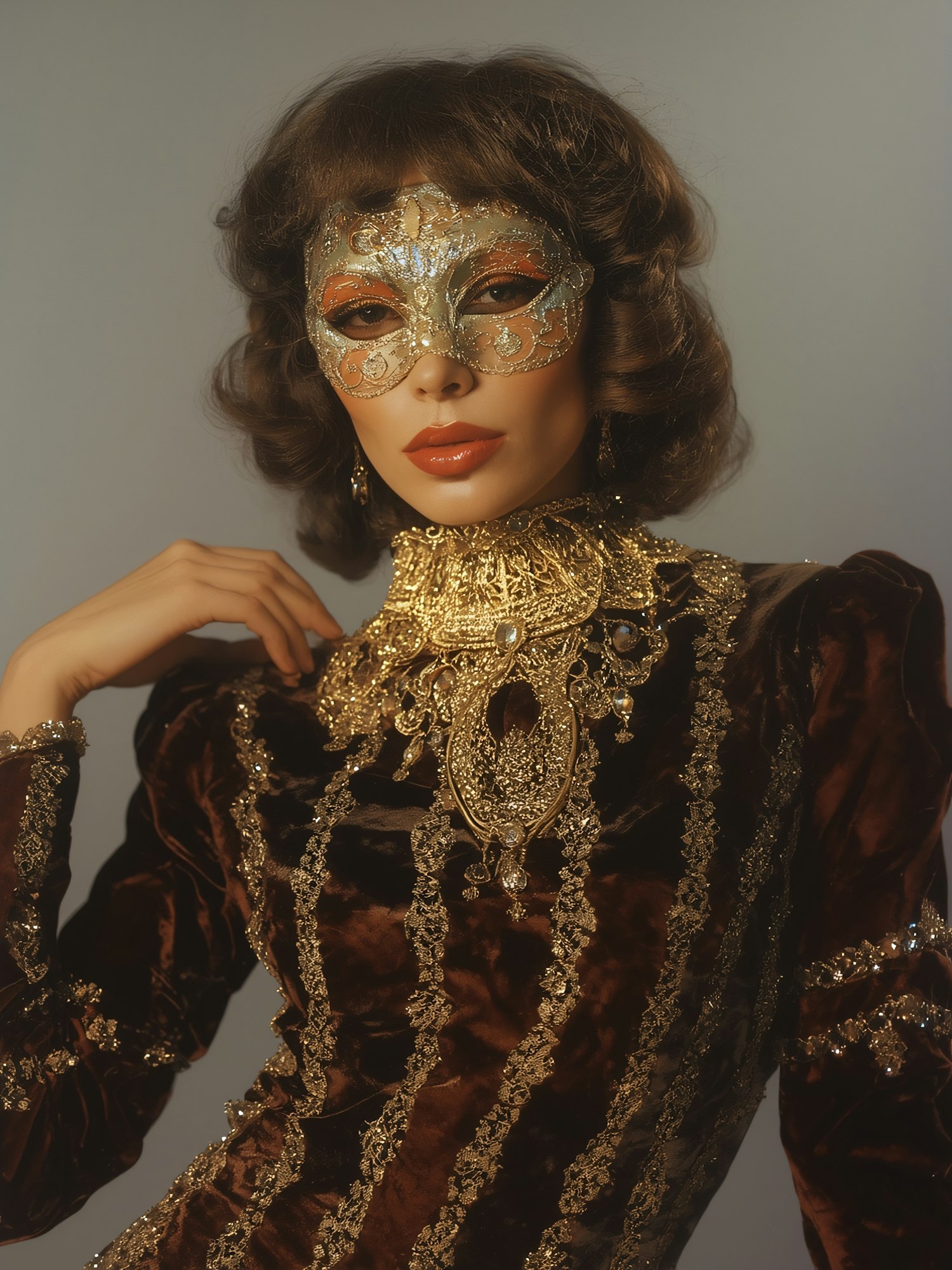 A woman in a luxurious velvet gown and ornate mask poses gracefully, showcasing intricate golden details and elegant styling.