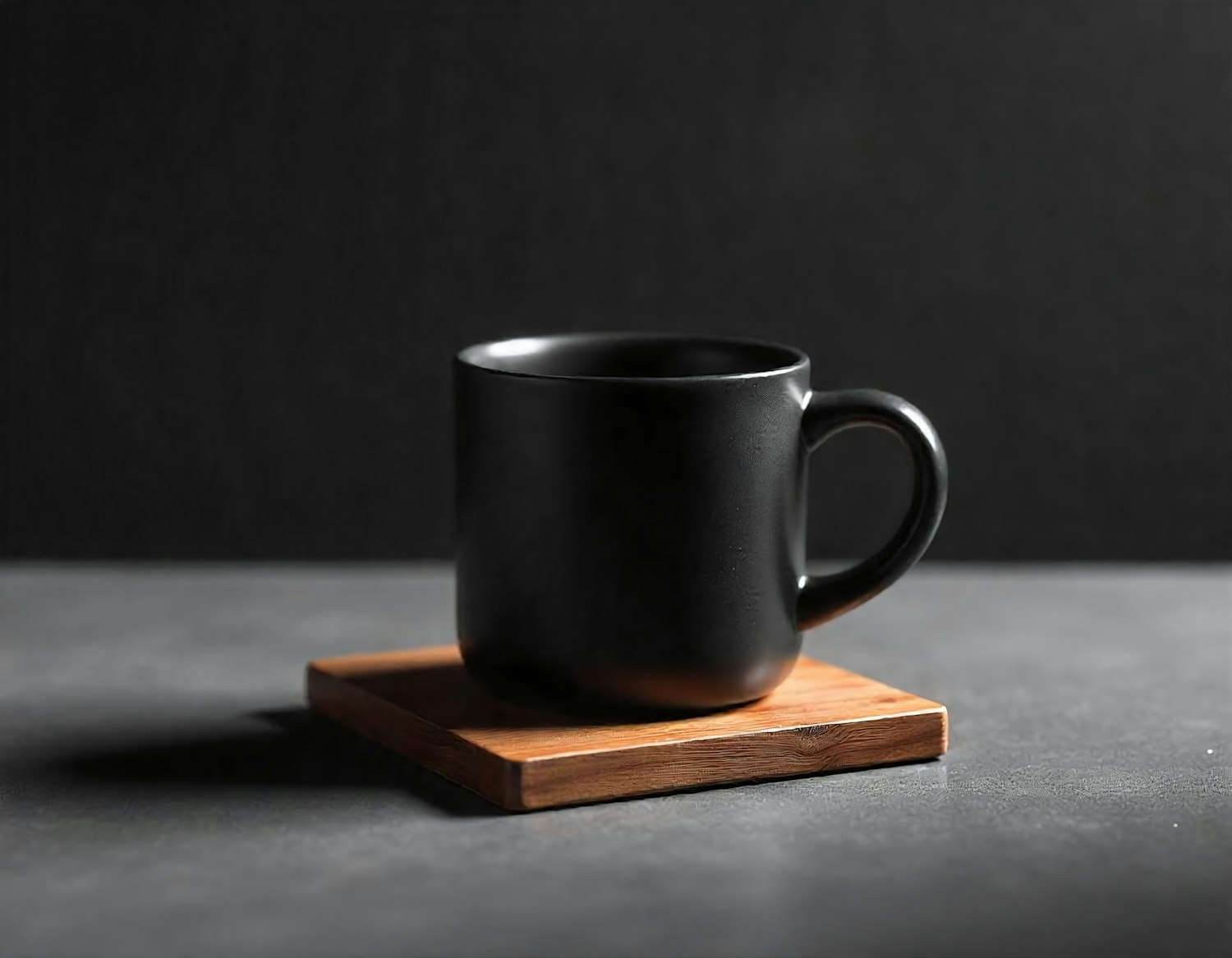 Sleek black ceramic mug on a wooden coaster against a dark gray background, exuding minimalist elegance and modern design.