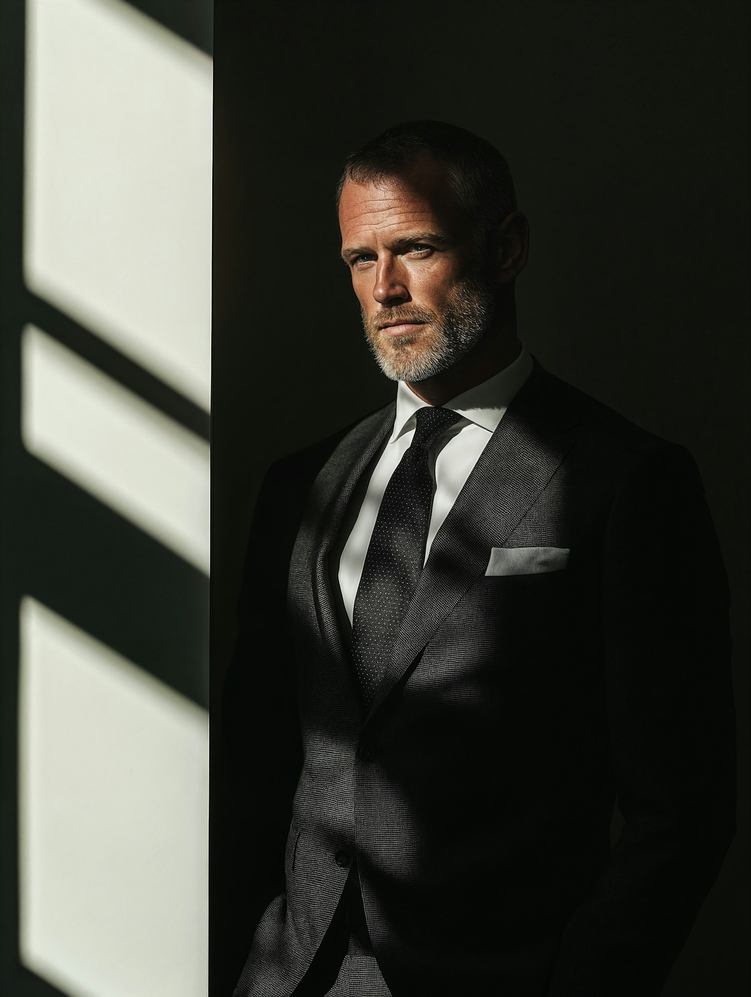 A sharply dressed man in a dark suit stands in dramatic lighting, with shadows and beams of light creating a striking visual effect.