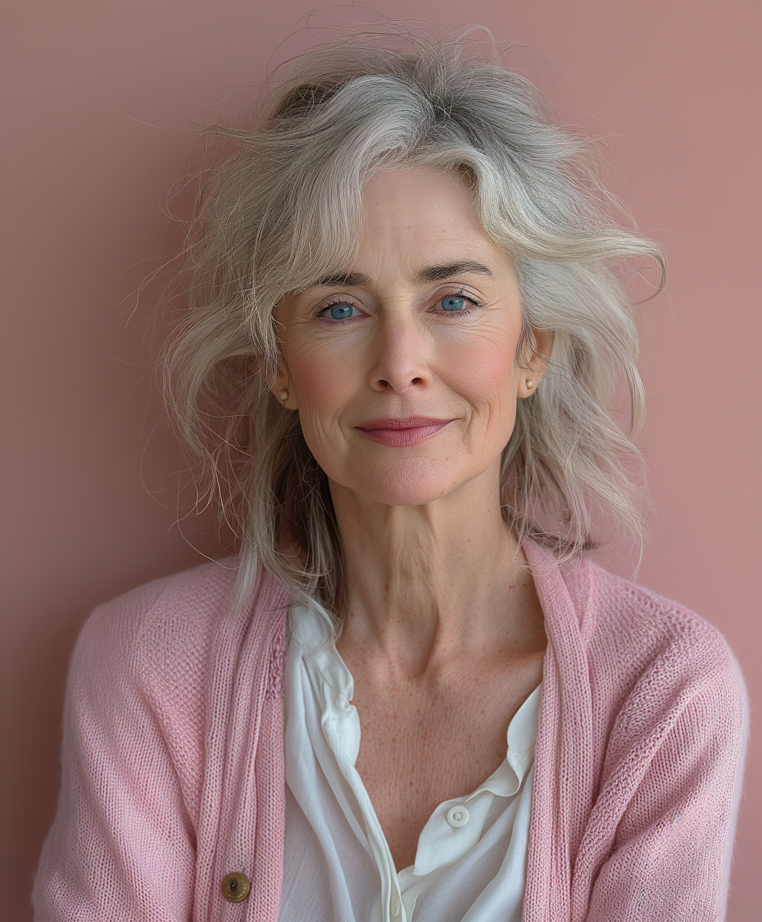 Elegant mature woman with silver hair and blue eyes, wearing a pink cardigan against a pastel background, exuding warmth and grace.