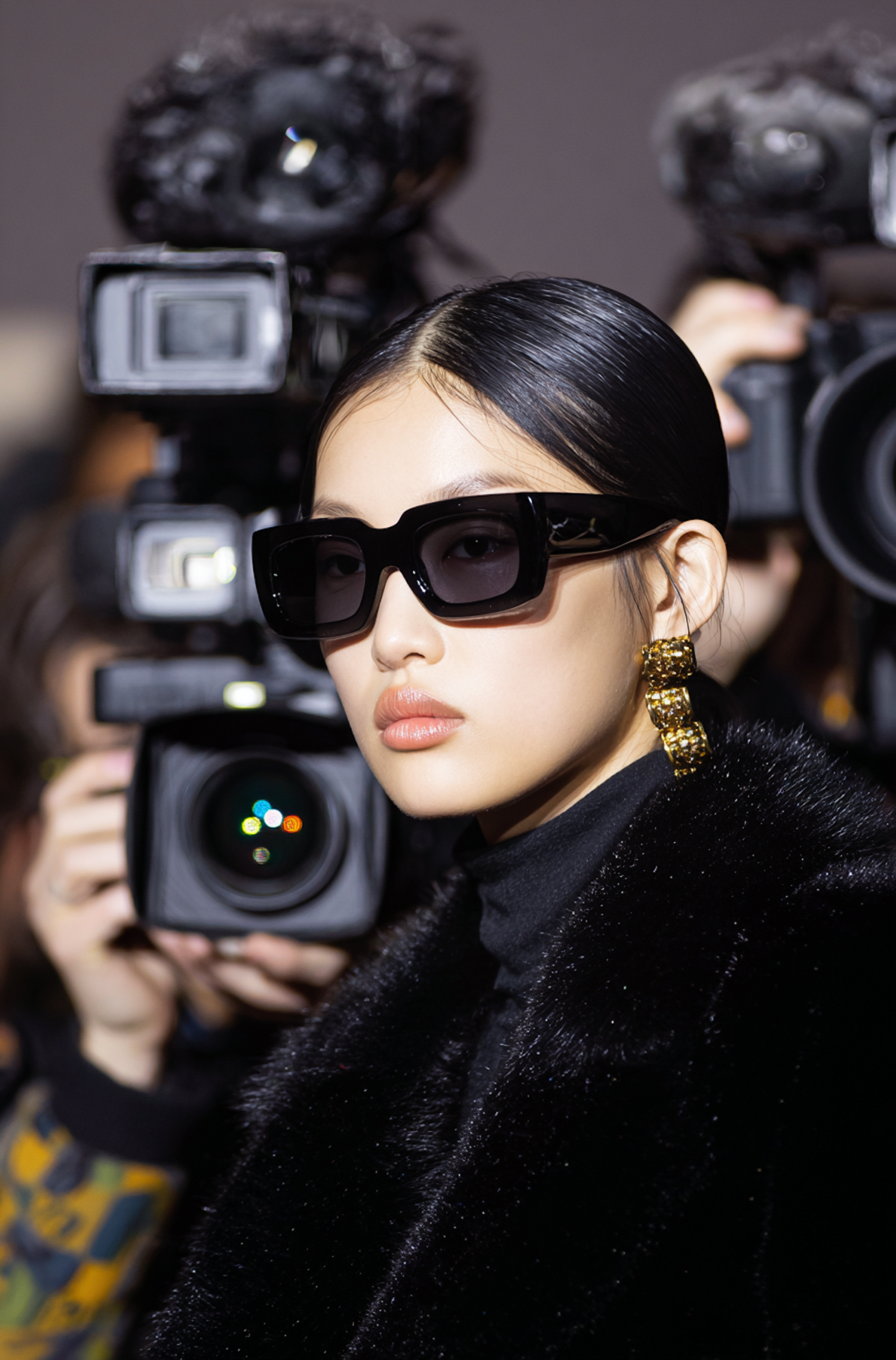 Stylish individual in black sunglasses and fur coat in front of cameras, highlighting modern fashion and gold statement earrings.