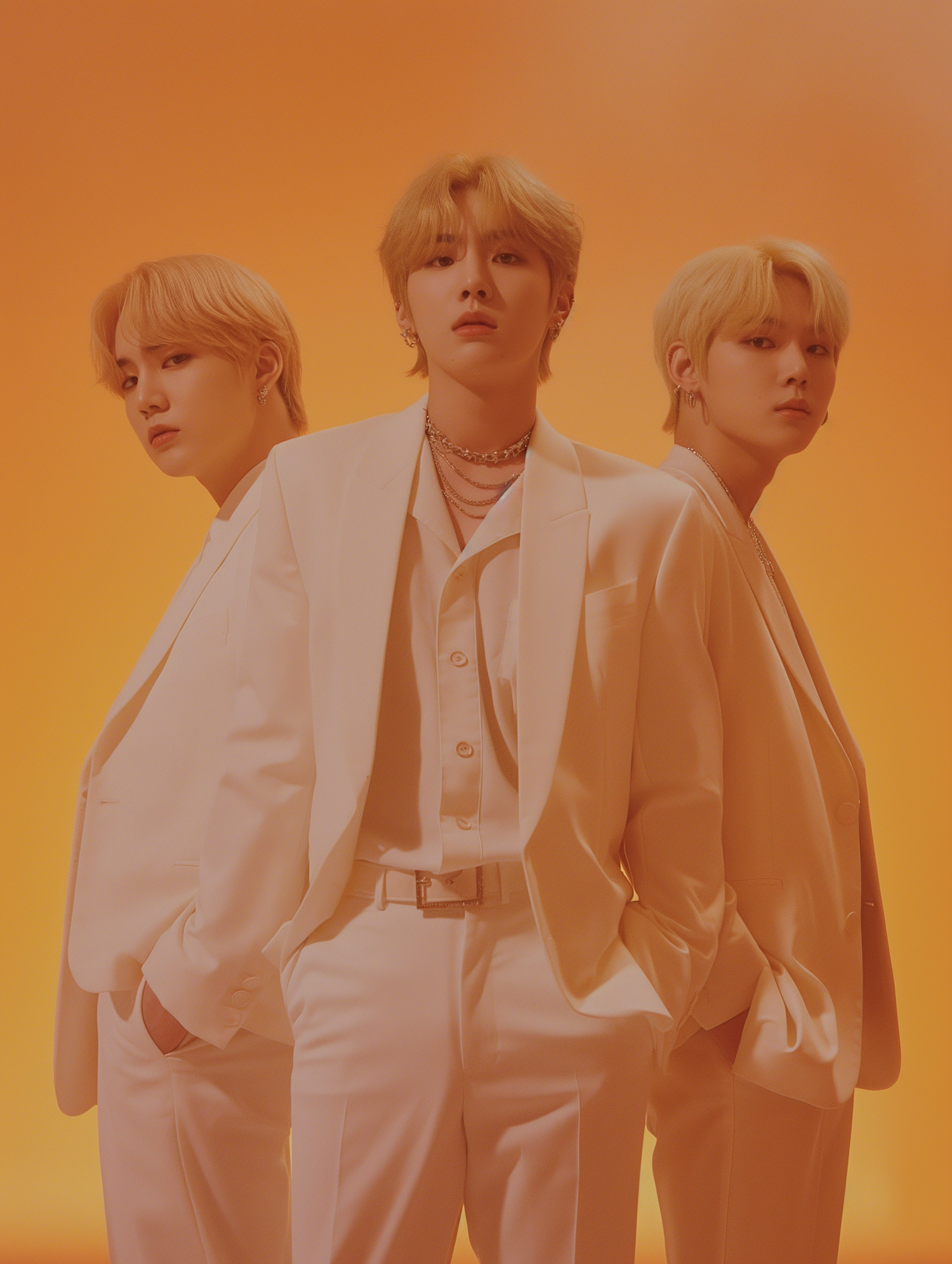 Three stylish young men in white suits pose against a warm orange backdrop, exuding confidence and elegance.