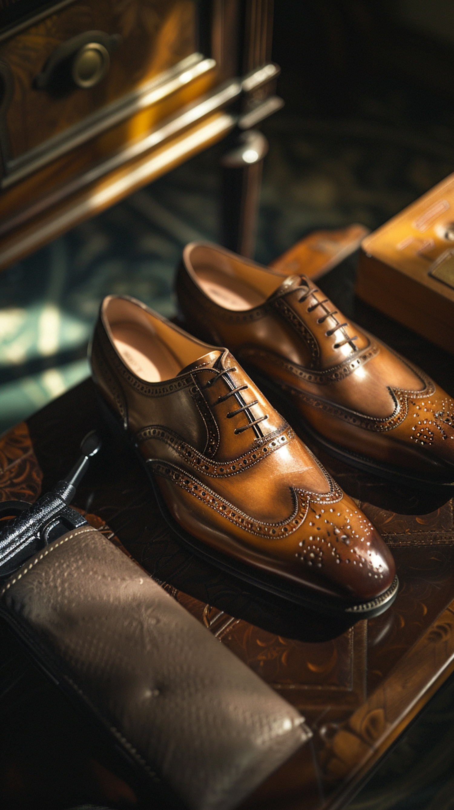 Elegant brown leather brogue shoes with intricate designs, set on a textured surface, exuding luxury and sophistication.