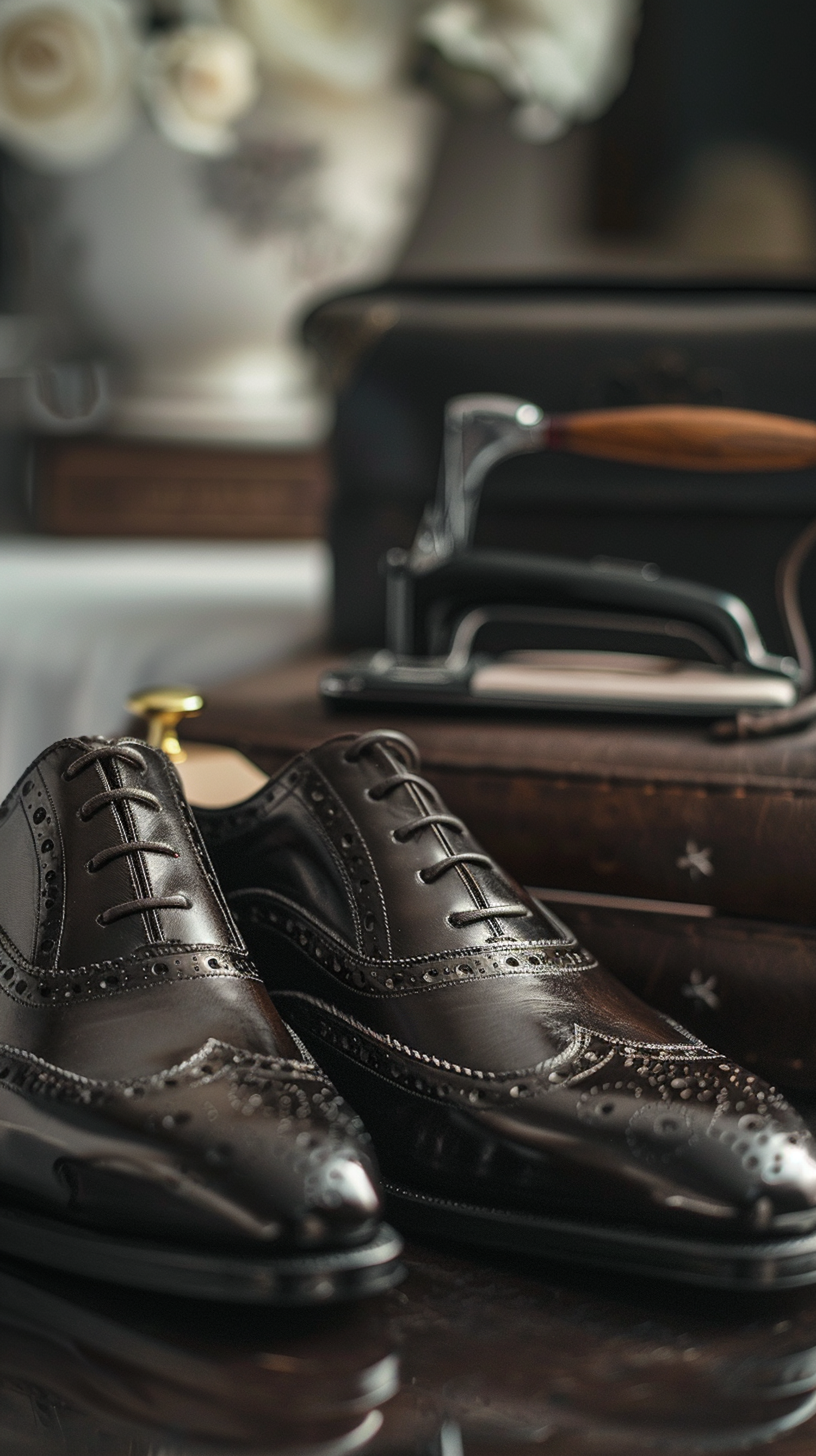 Elegant dark brown brogue shoes with intricate patterns, set against a vintage iron and white roses for a classic, sophisticated look.