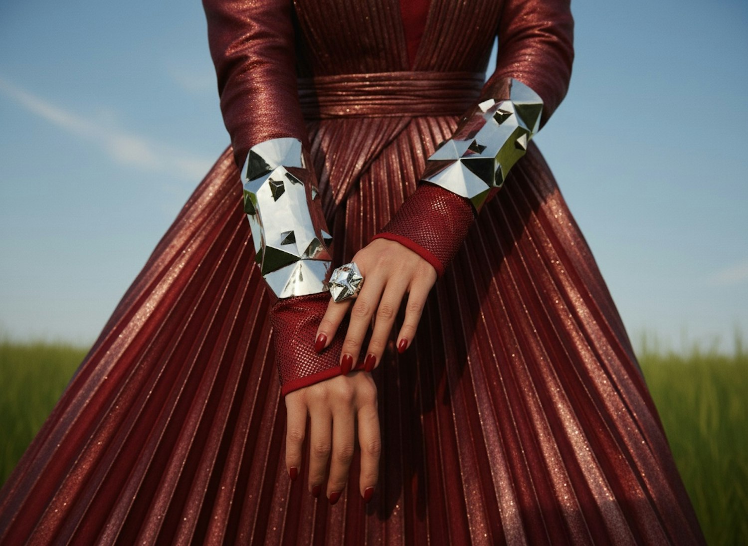 Close-up of a metallic red dress with reflective cuffs and a faceted ring, set against a natural blurred background.