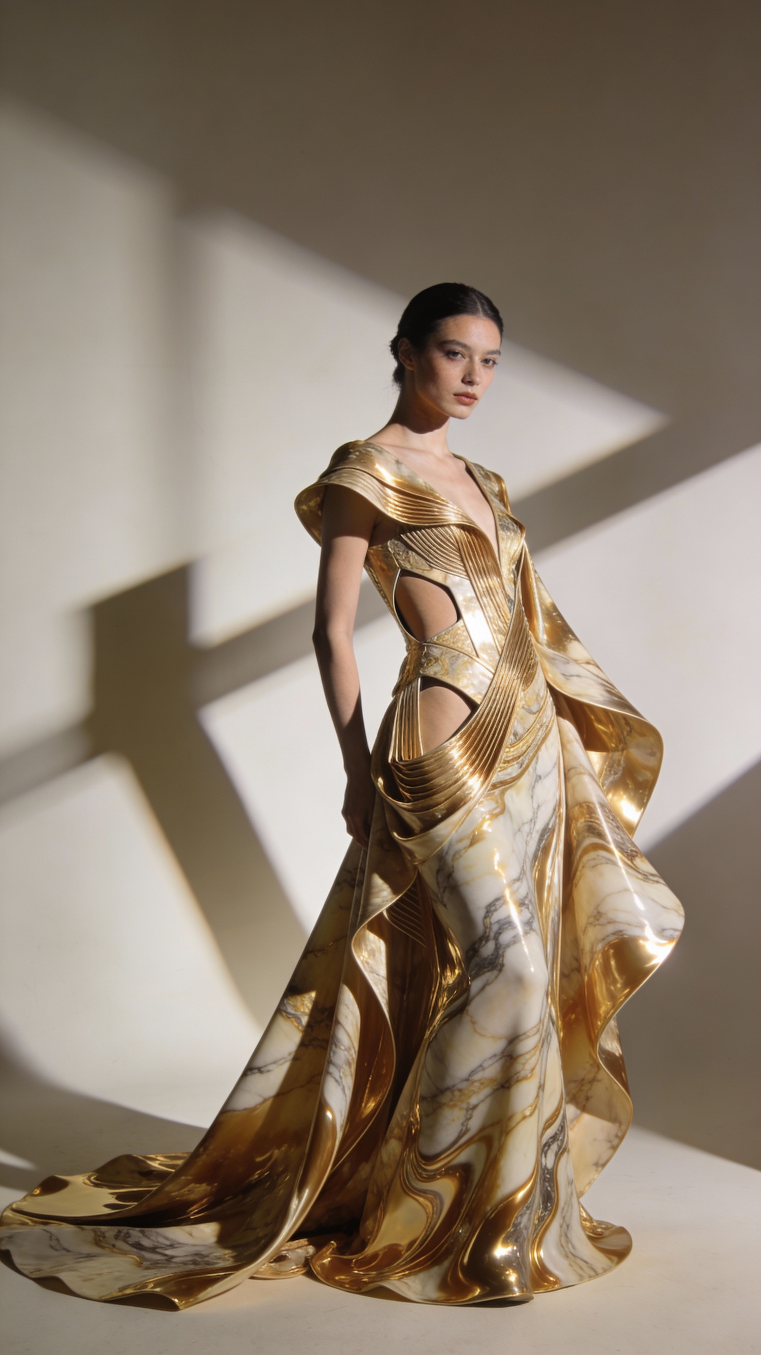 A model in a stunning gold and marble-patterned gown with intricate cutouts and flowing details, captured in dramatic lighting.