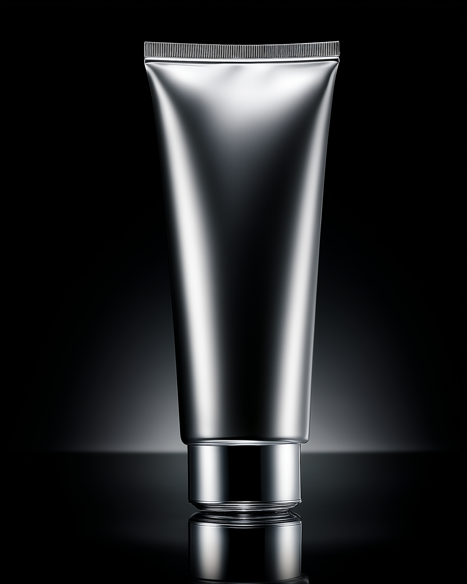 Sleek metallic tube with a reflective finish, perfect for cosmetics or skincare, set against a dark gradient background.