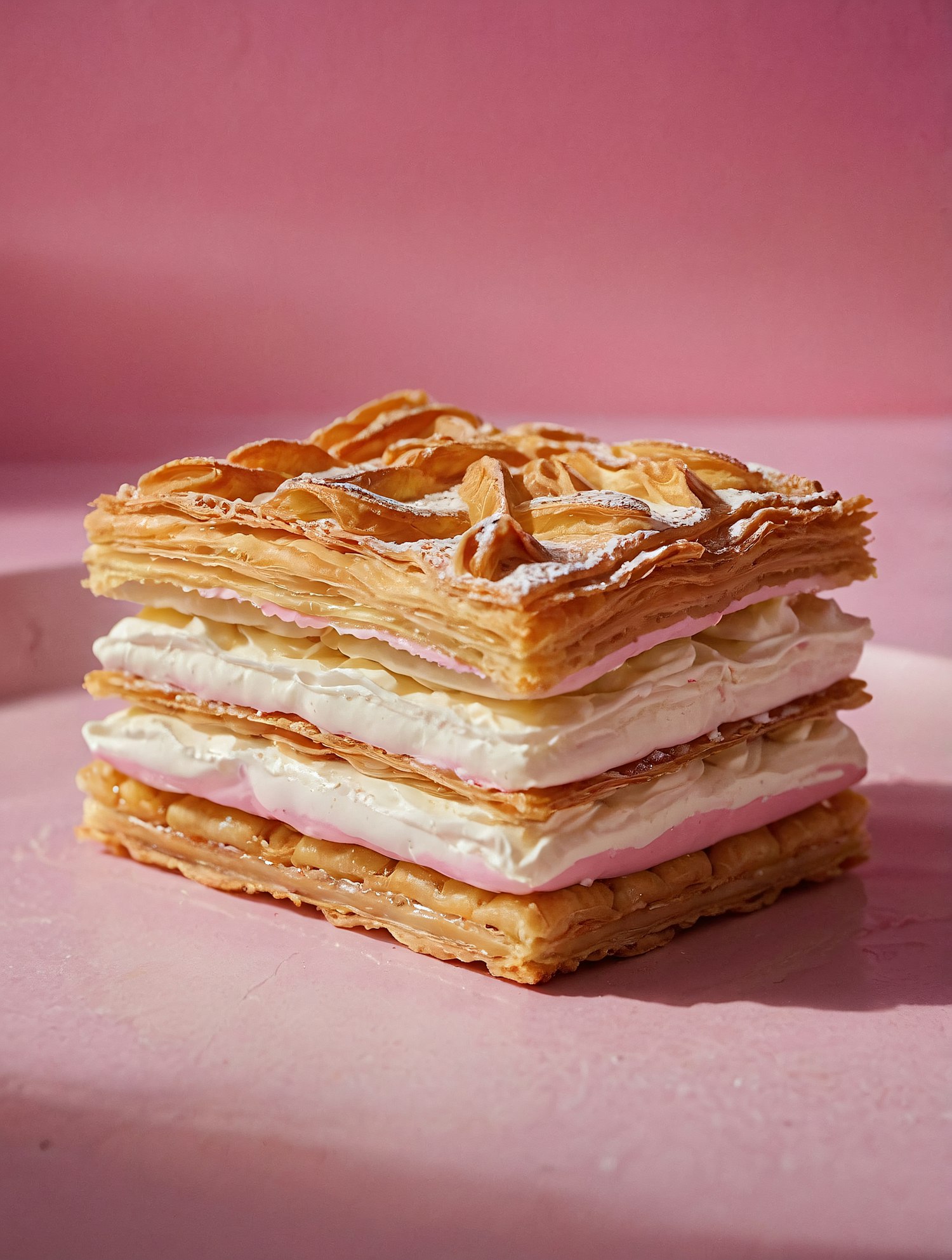 Delicious mille-feuille dessert with flaky pastry, whipped cream, and pink cream layers on a pastel pink background.