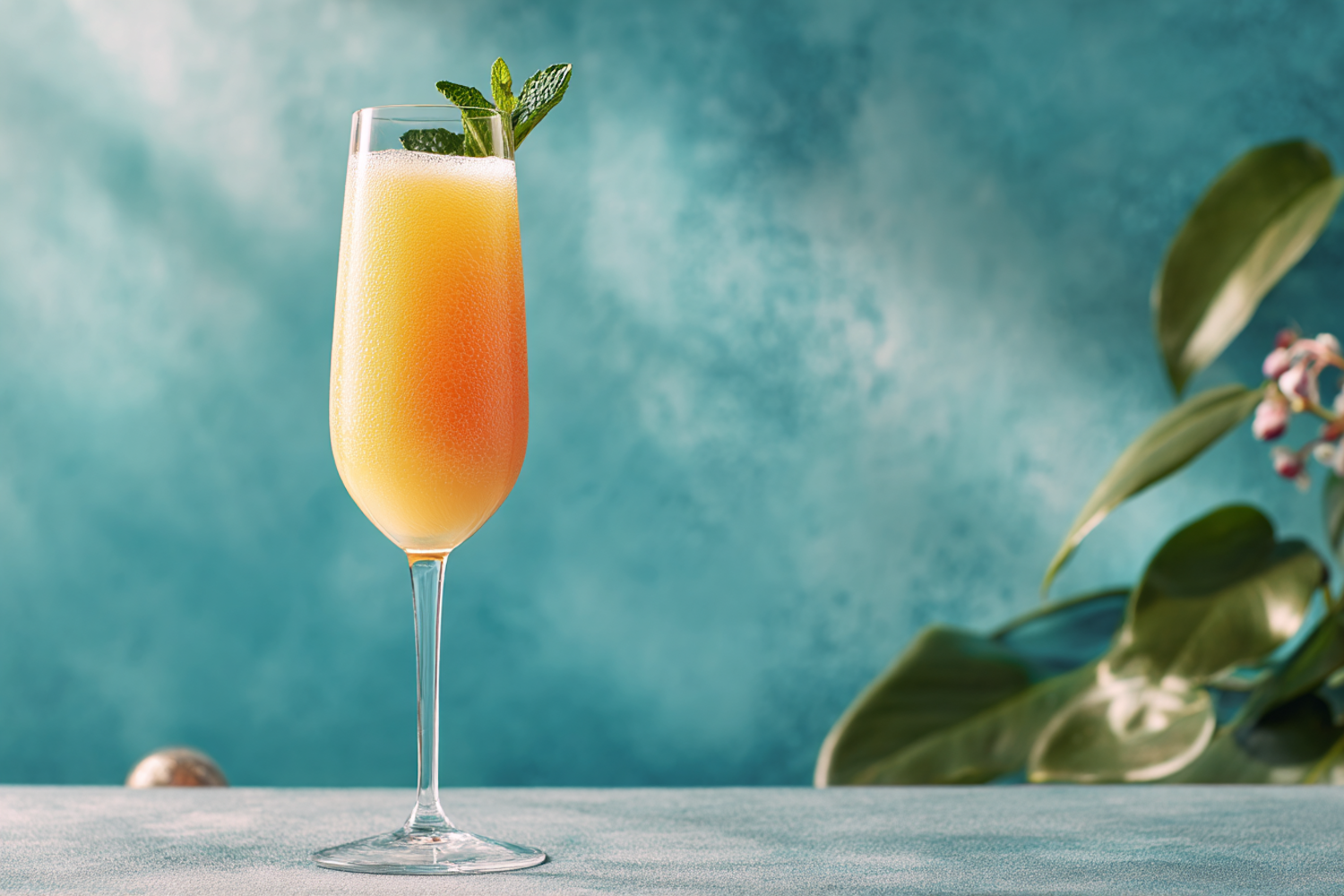 A refreshing orange mimosa in a champagne flute, garnished with mint, set against a teal background with tropical accents.