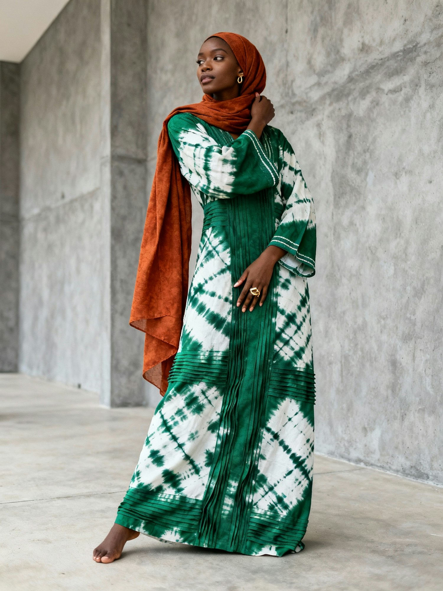 A woman in a green tie-dye dress and orange headscarf stands against a concrete wall, exuding elegance and style.
