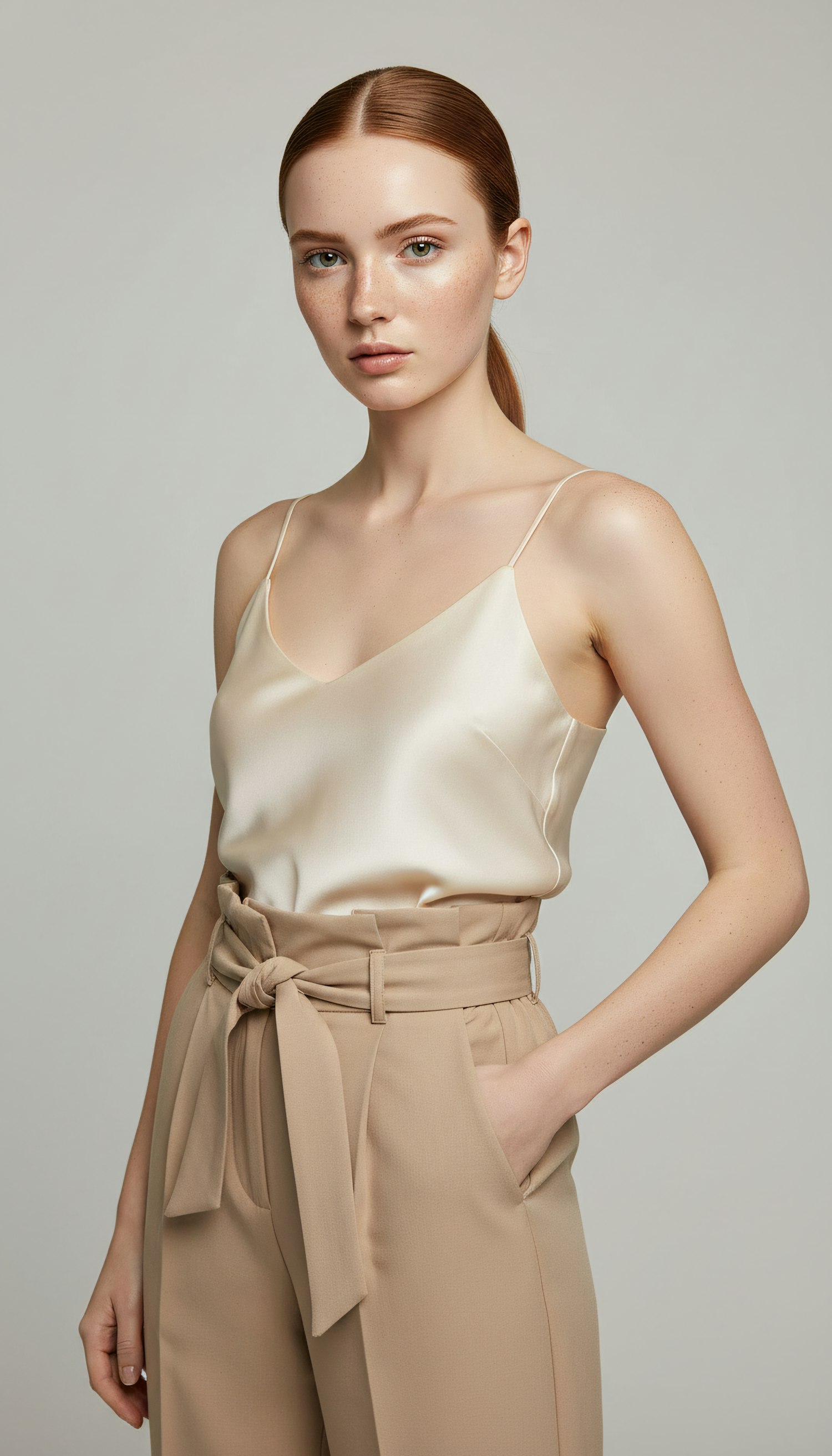 A woman in a satin camisole and beige trousers poses against a light background, showcasing a minimalist and elegant style.