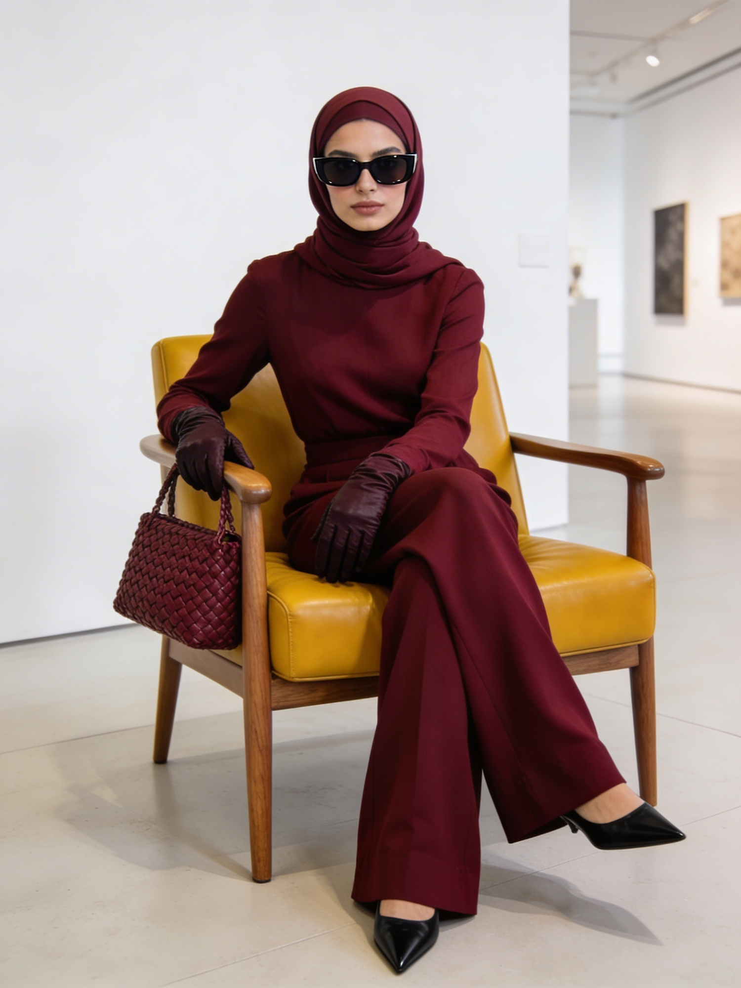 A high‑definition, editorial fashion photo of a stylish person sitting confidently on the armrest of a mustard‑yellow leather chair with wooden arm supports. They wear a fully coordinated deep‑burgundy outfit: long‑sleeved top, wide‑leg trousers, and a matching hijab styled neatly. Accessories include dark rectangular sunglasses, fitted gloves, and a woven‑texture handbag in the same burgundy tone. They wear pointed black shoes. The setting is minimalist with a clean white wall and light flooring, creating a modern, gallery‑like atmosphere. Soft natural lighting casts gentle shadows, highlighting the rich textures and monochrome palette. No logos, no watermarks, no extra text.