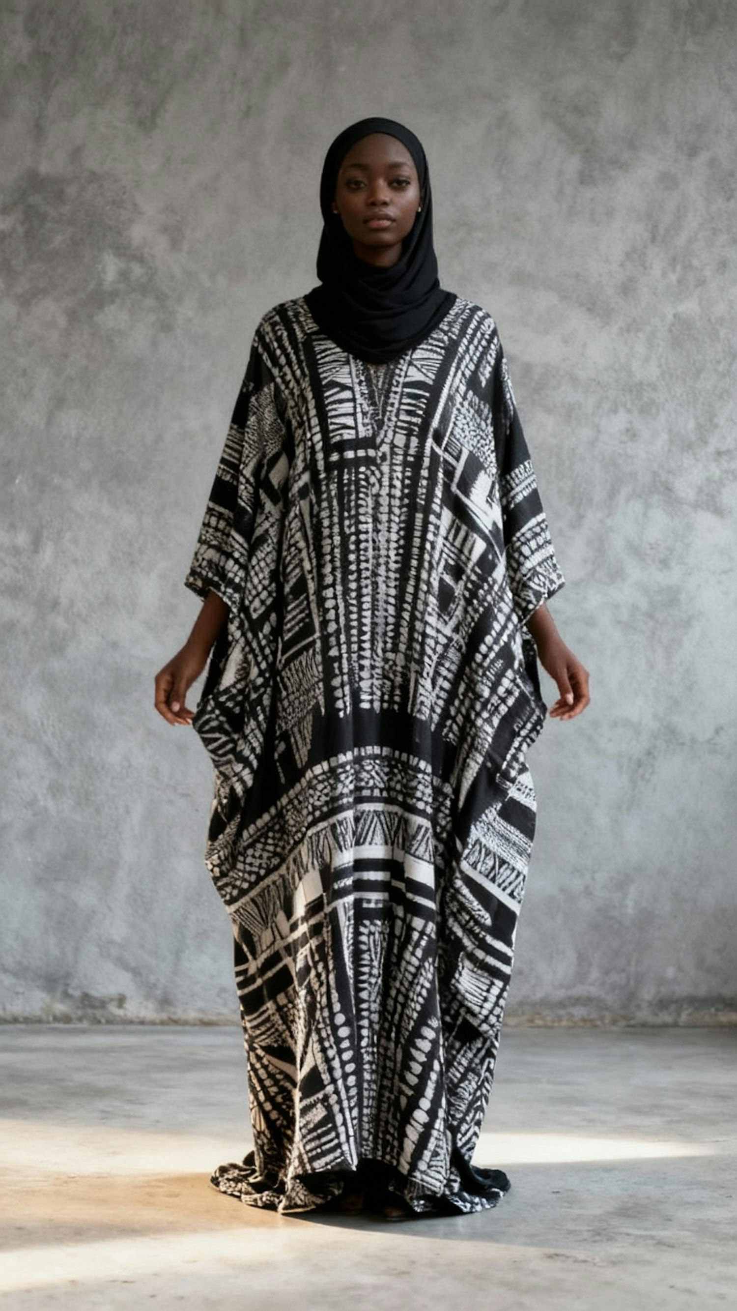 A woman in a black and white patterned dress stands against a textured gray wall, exuding elegance and simplicity.