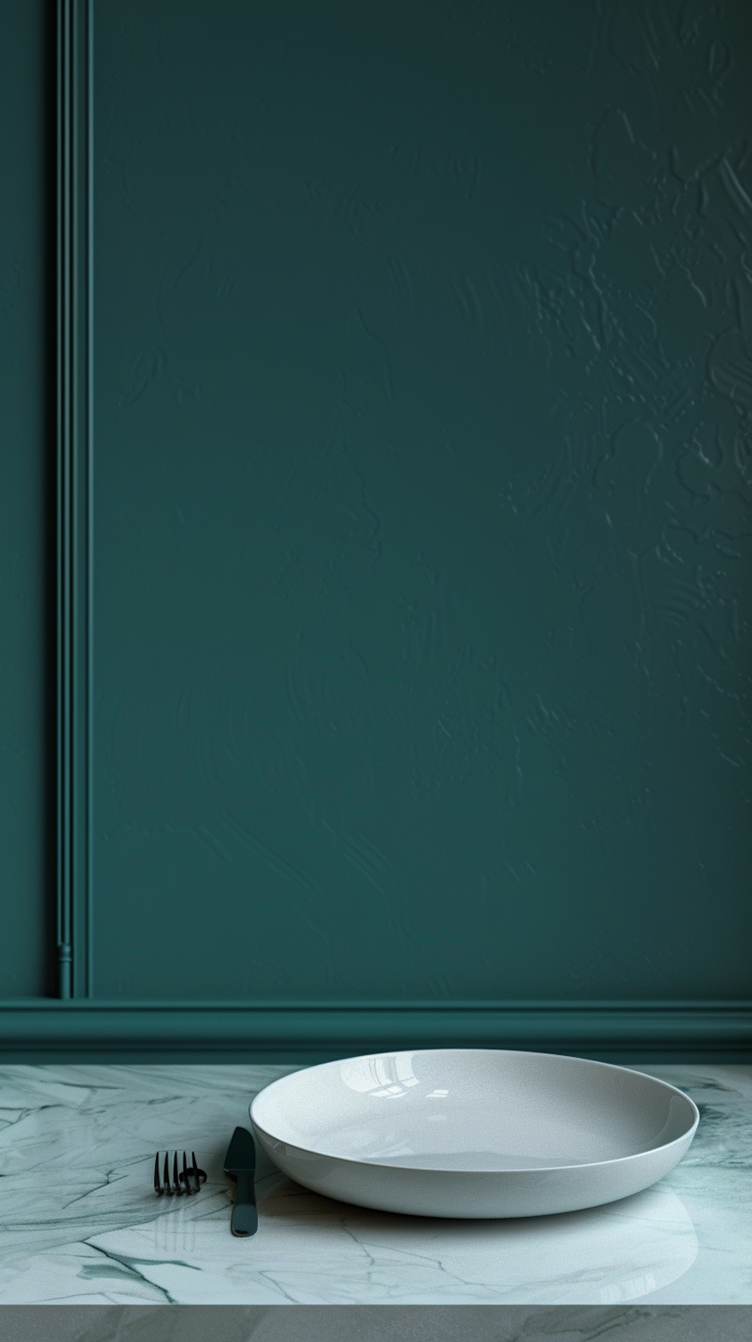 Minimalist dining setup with a white bowl, black cutlery, and a marble countertop against a teal wall.
