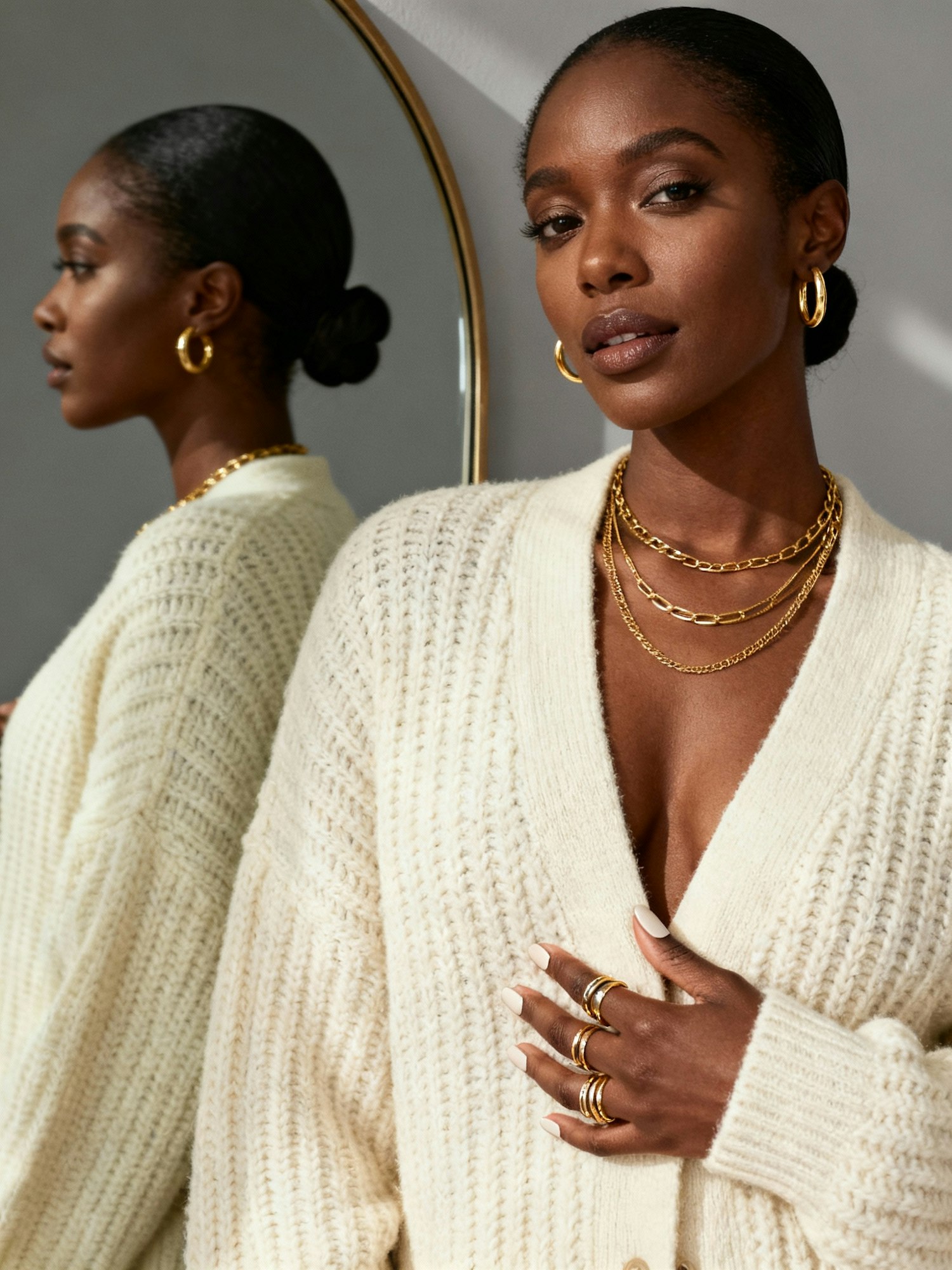 A stylish woman in a cream knit cardigan and gold jewelry poses by a mirror, showcasing her elegant accessories and polished look.