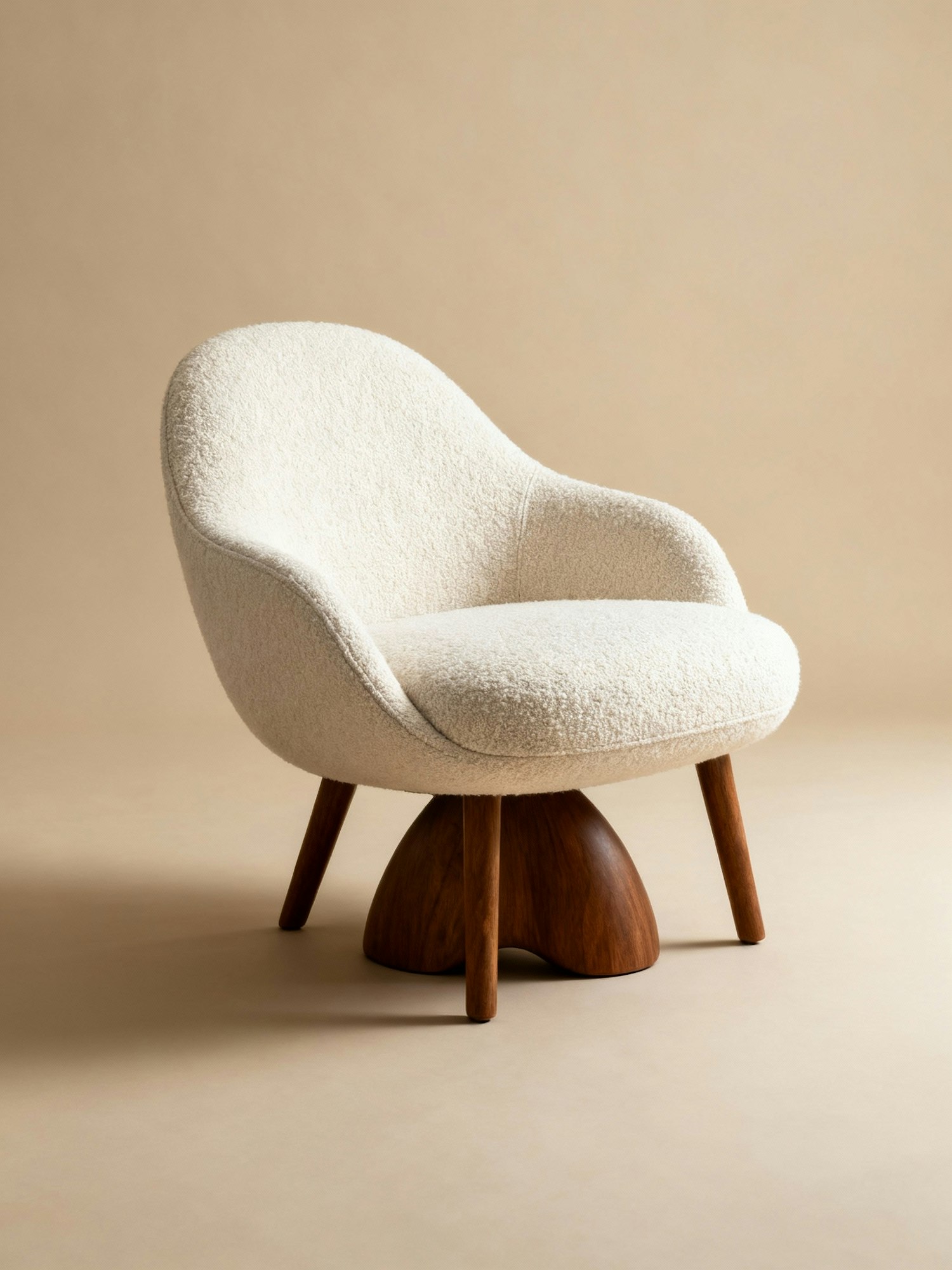 Professional studio photography, neutral beige background, soft diffused lighting, sharp focus. A retro-modern armchair with organic curves, a rounded backrest and wide seat, upholstered in off-white boucle fabric. It has four slightly angled walnut wooden legs and a sculptural wooden base in a mid-century style. The proportions are generous yet compact, with a smooth silhouette and timeless aesthetic. Photographed from a 3/4 diagonal angle, highlighting both the front and side profile, showing depth and curvature.