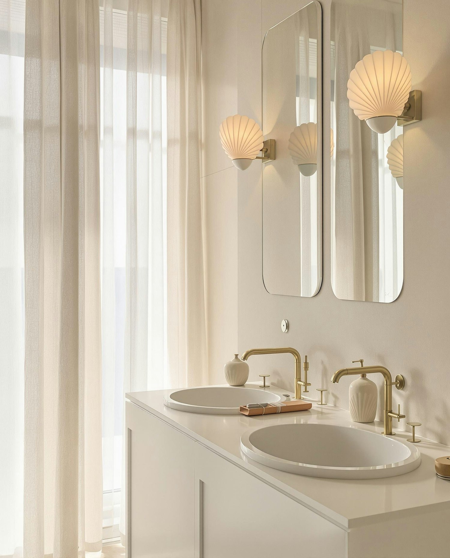 Elegant bathroom with double vanity, gold faucets, shell sconces, and sheer curtains for a soft, luxurious vibe.