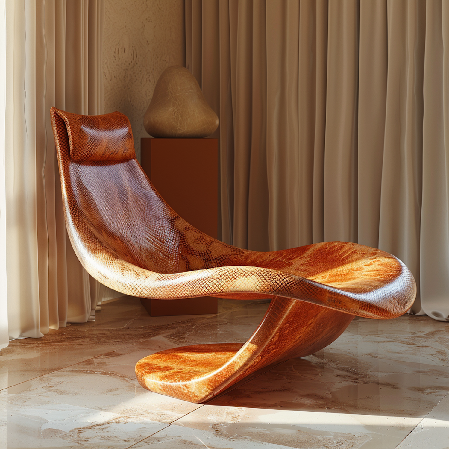 Sculptural chair with snake skin texture in a sunlit room, featuring marble floors and elegant beige curtains.