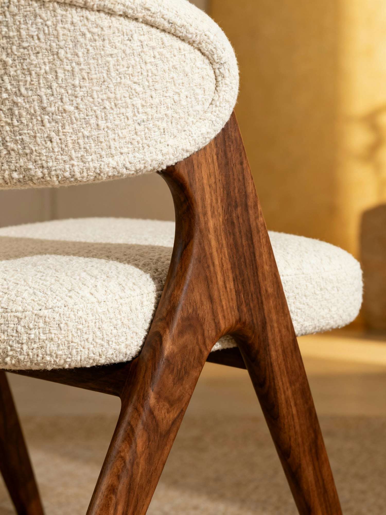 Close-up of a modern chair with cream fabric upholstery and polished wooden frame, highlighting its elegant design and craftsmanship.