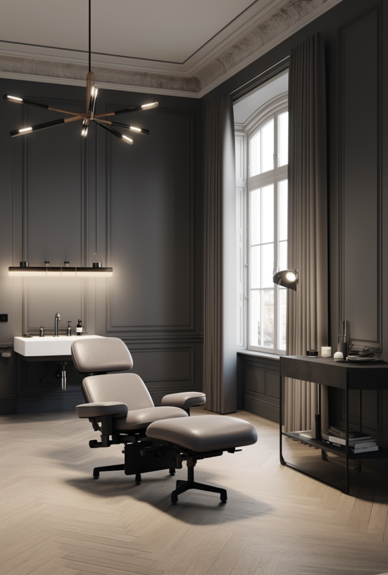 Luxurious modern room with a reclining chair, dark gray walls, and elegant lighting. Features a large window and sleek furnishings.