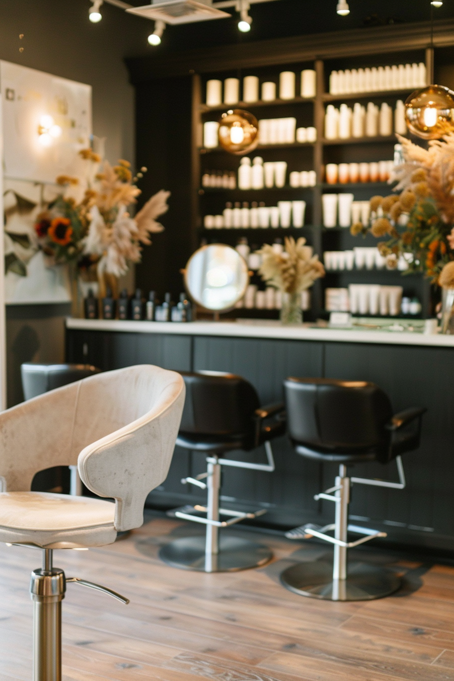 Chic hair salon interior with plush chairs, wooden floors, and stylish decor. Warm lighting and organized shelves create a cozy ambiance.