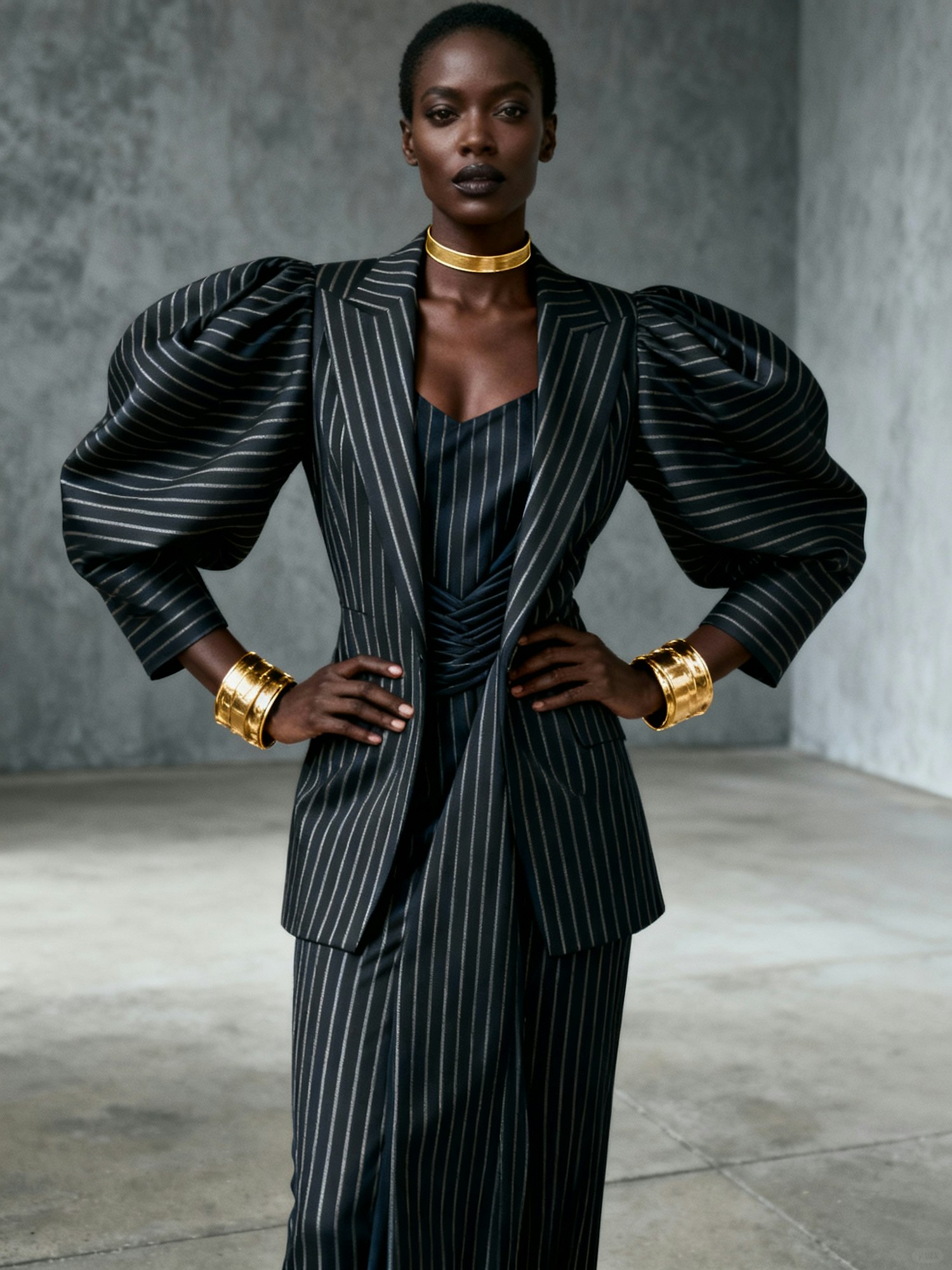 Full-body portrait of a black woman wearing a luxurious, corporate outfit featuring bold, a vertical stripes with a matching inner wear for modesty. The outfit has a voluminous sleeves, She is accessorized with chunky, statement gold cuff bracelets on both wrists and a thin gold choker necklace. The pose is confident and elegant, The background is a minimalist composition of textured gray walls and a smooth concrete floor. Soft, even lighting meticulously highlights the rich textures of her garment and the intensity of her expression. The style is cinematic, sharply focused, and exudes an artistic high-fashion vibe that emphasizes her bold presence.