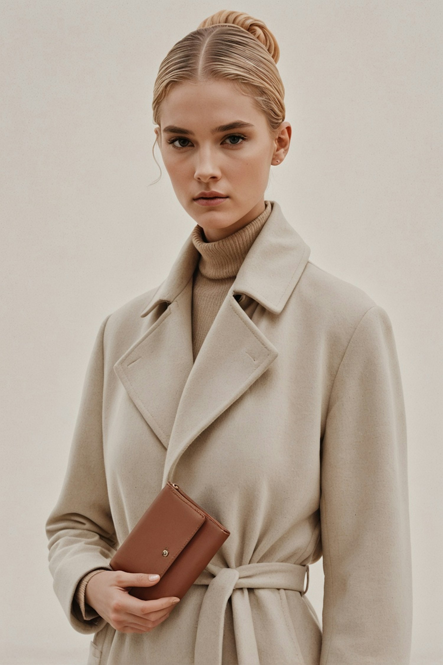 Elegant woman in a beige coat and turtleneck holding a brown leather wallet. Minimalist style with soft, neutral tones.