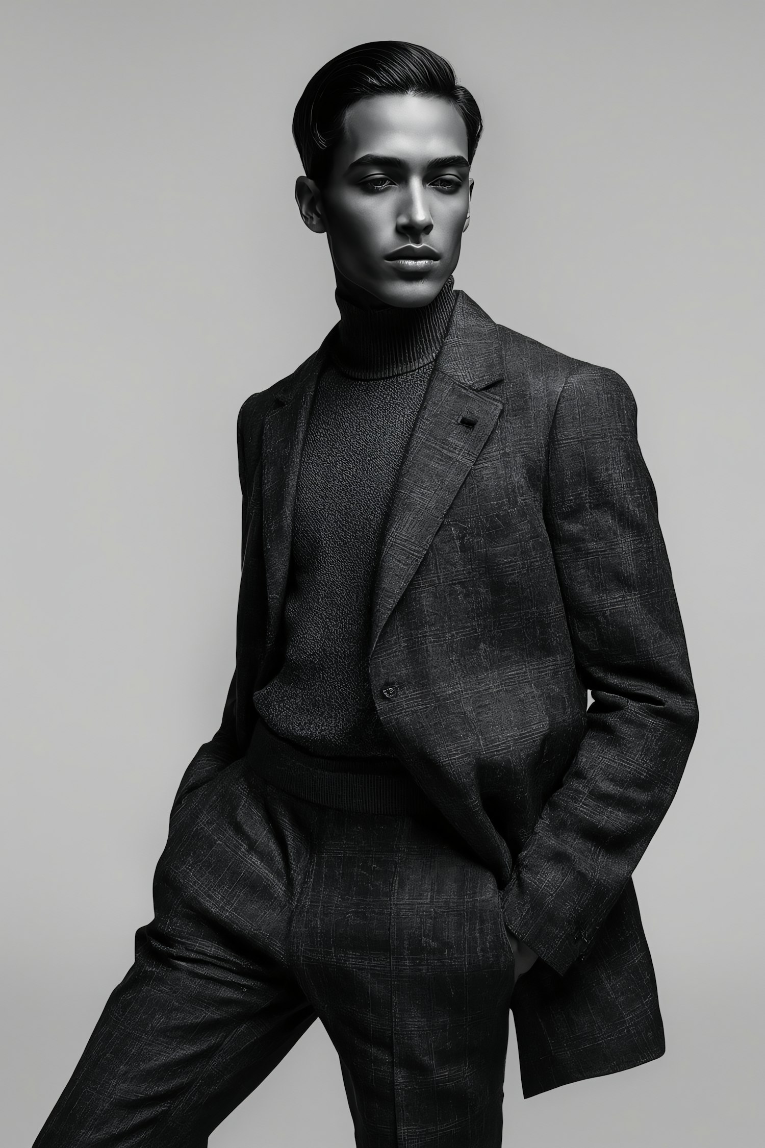 Stylish monochrome portrait of a man in a textured suit and turtleneck, showcasing sleek fashion and elegant lighting.