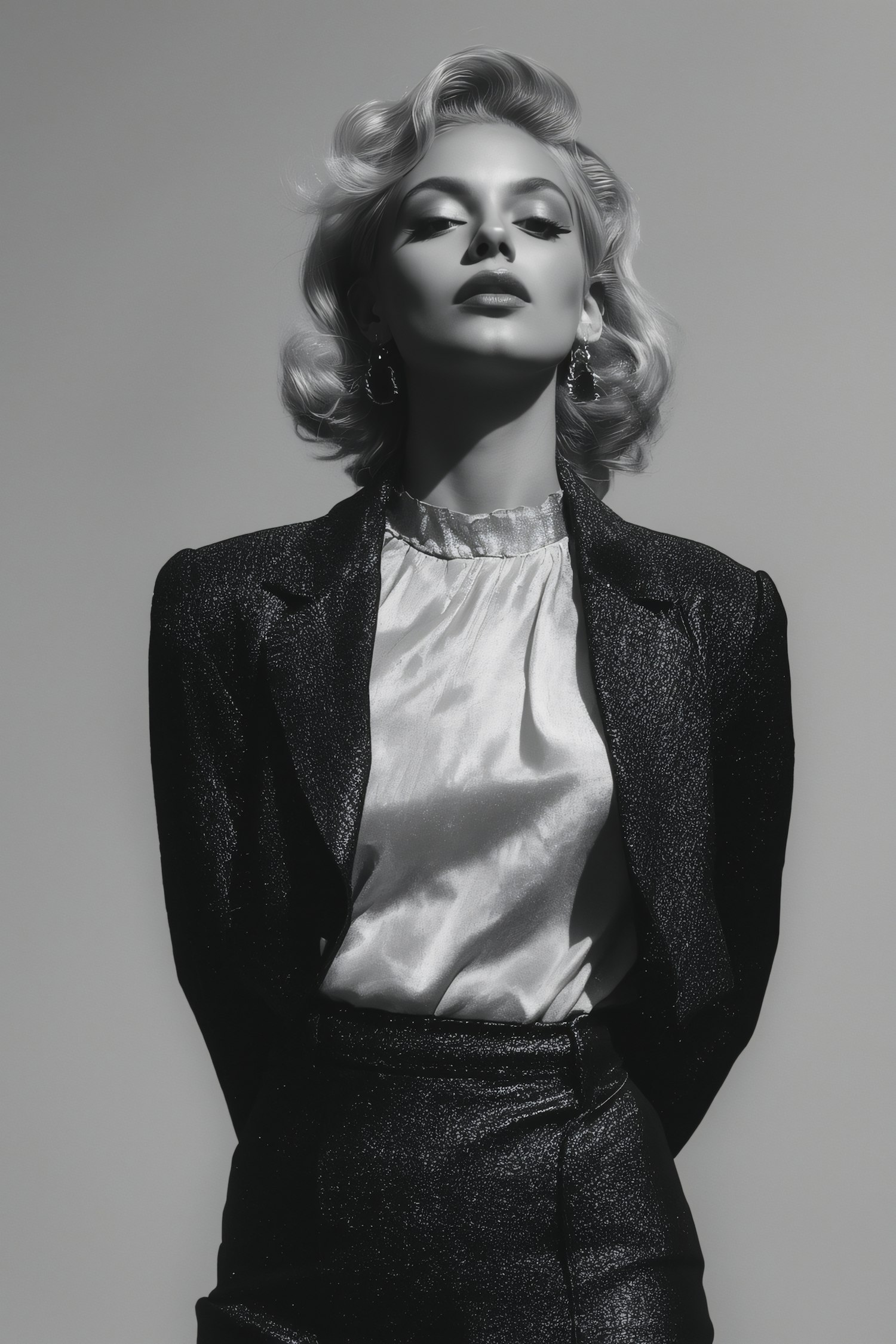 Monochrome portrait of a stylish individual in a shimmering suit, exuding elegance and confidence with dramatic lighting.