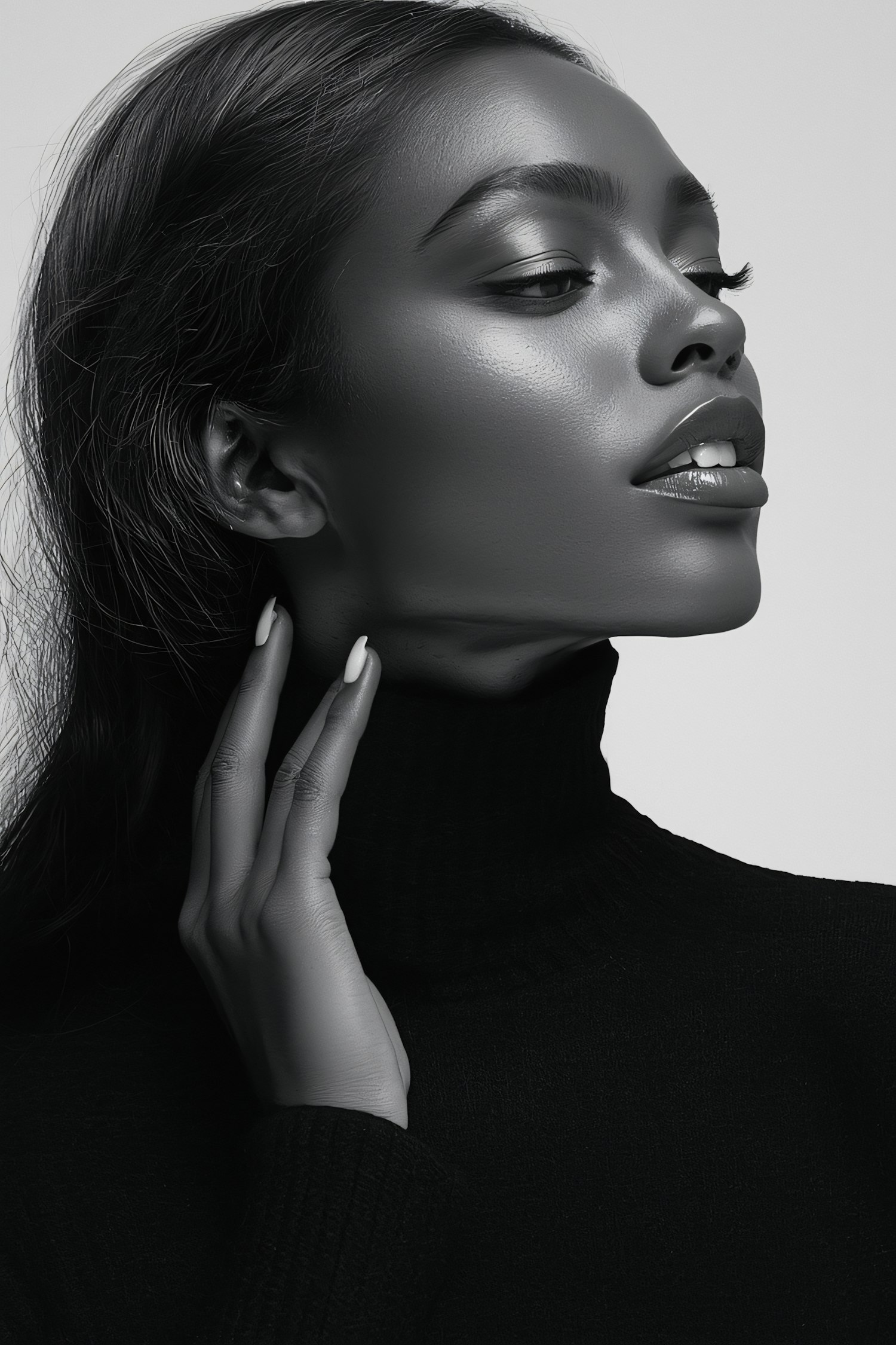 Monochromatic portrait of a woman in a black turtleneck, showcasing elegant features and a serene expression.