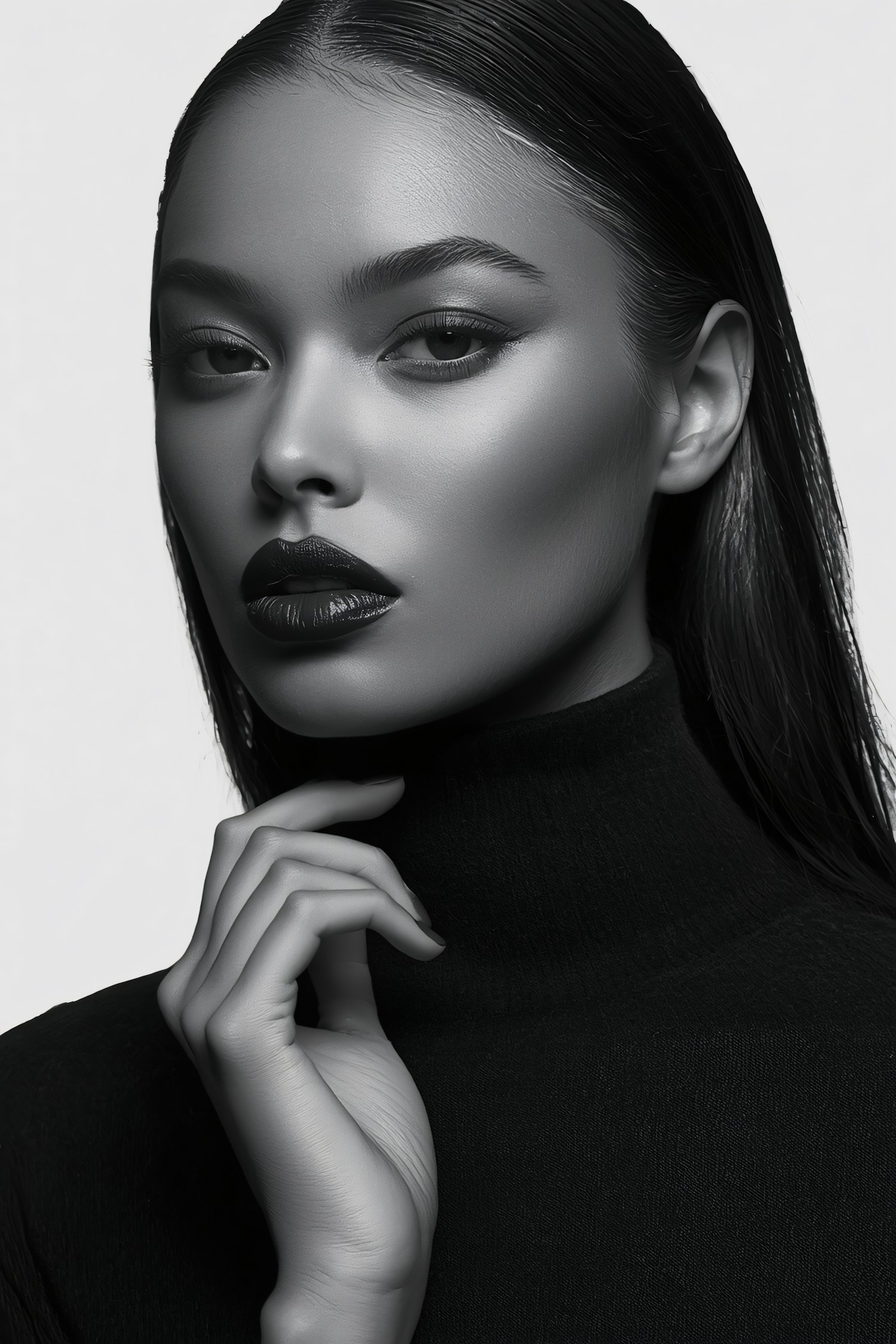 Monochromatic portrait of a person with sleek hair, sharp features, and a high-neck black garment, exuding elegance and sophistication.