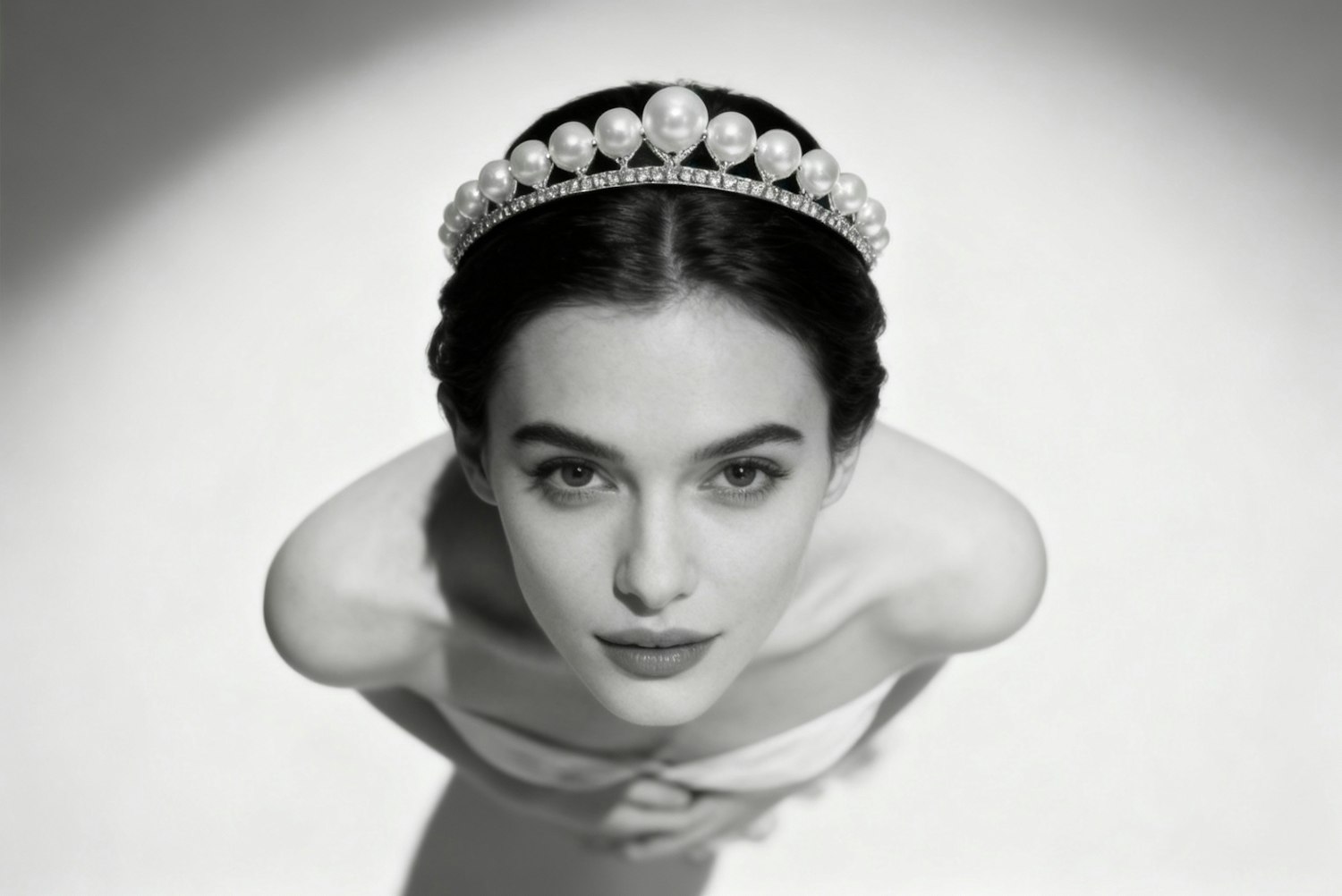 Elegant black-and-white portrait of a woman wearing a pearl tiara, gazing directly at the camera with a serene expression.