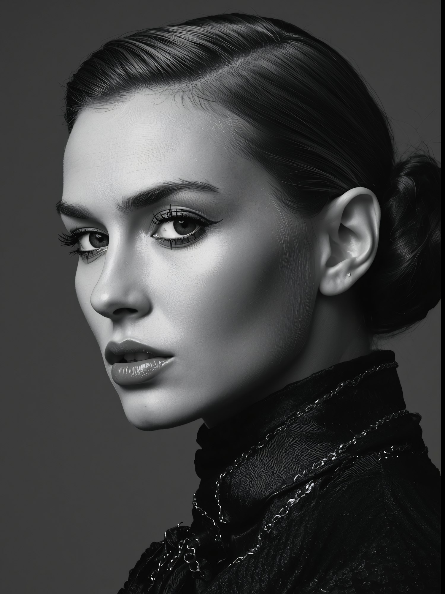 Monochrome portrait of a woman with elegant styling, dramatic makeup, and a high-collared outfit, exuding timeless sophistication.