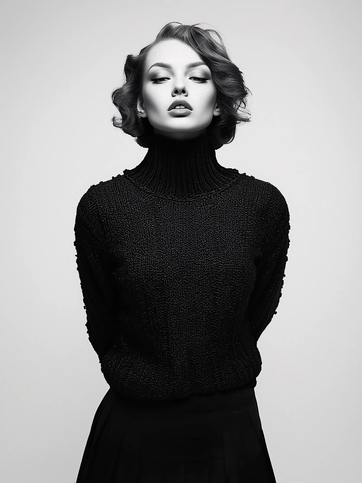 Monochrome portrait of a woman in a black turtleneck, showcasing elegance and style with a neutral background.