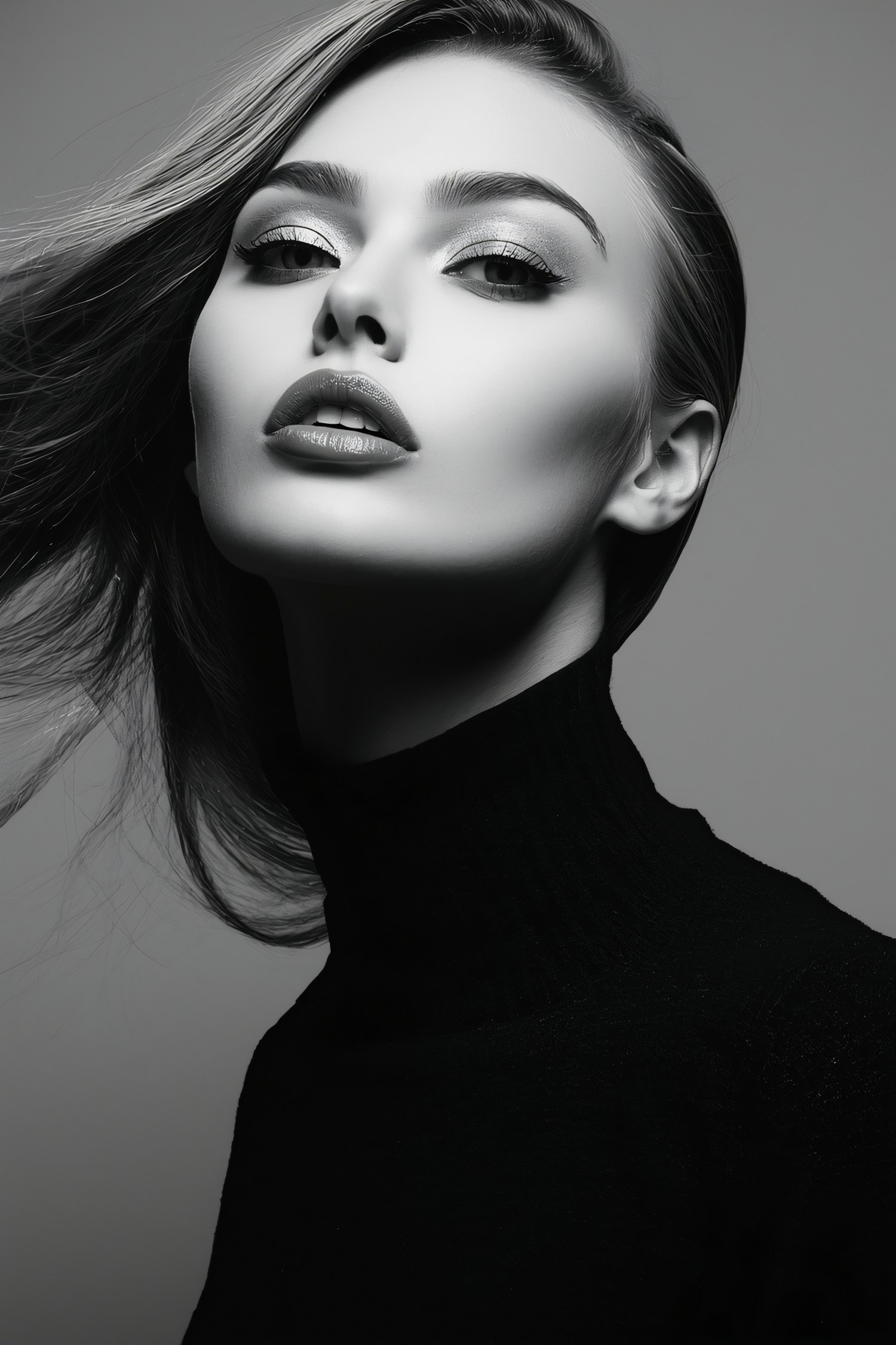 Monochrome portrait of a woman in a black turtleneck, with flowing hair and dramatic lighting emphasizing her features.