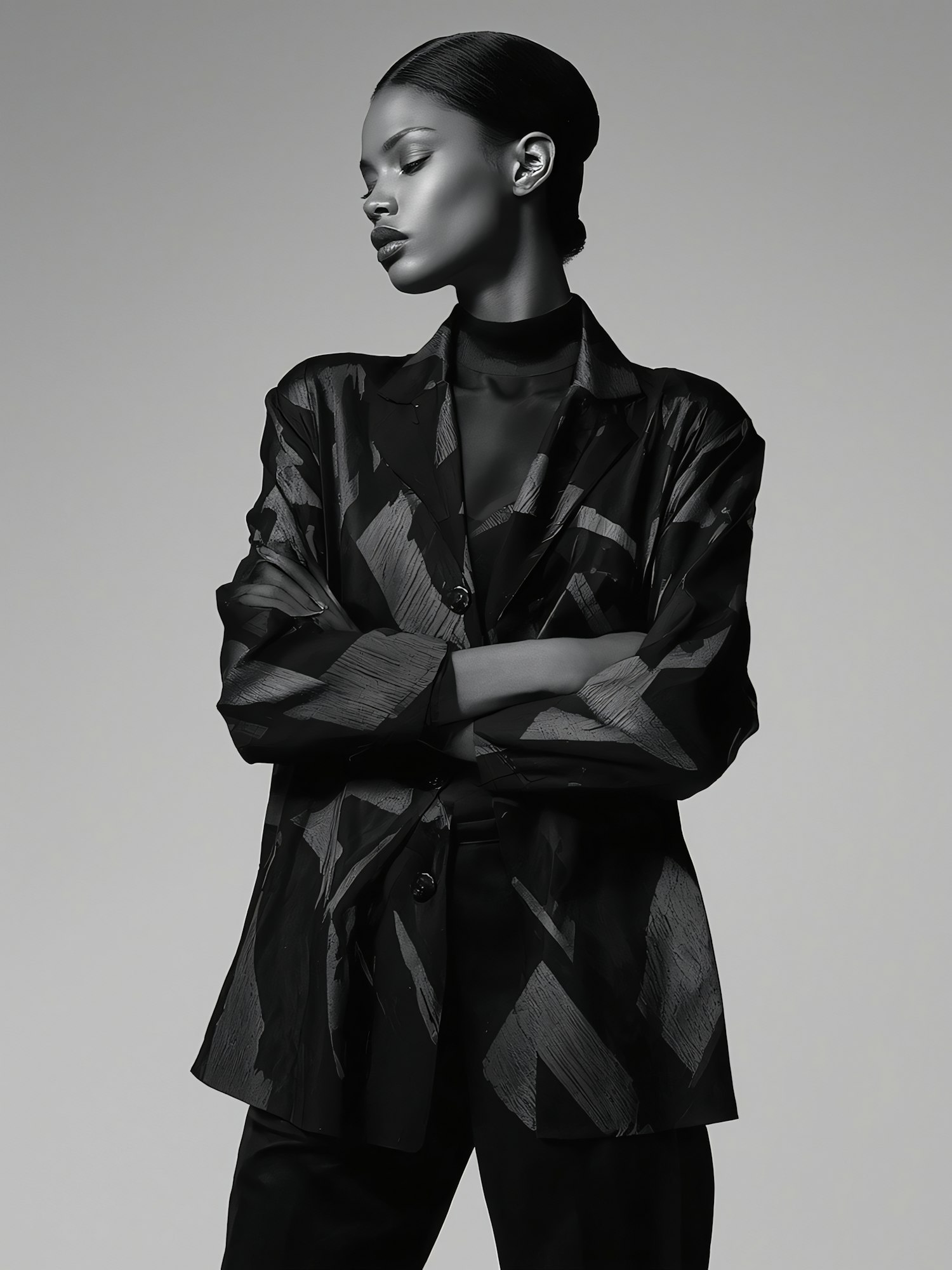 Monochromatic portrait of a stylish individual in a patterned jacket, showcasing elegance and modern fashion in a minimalist setting.