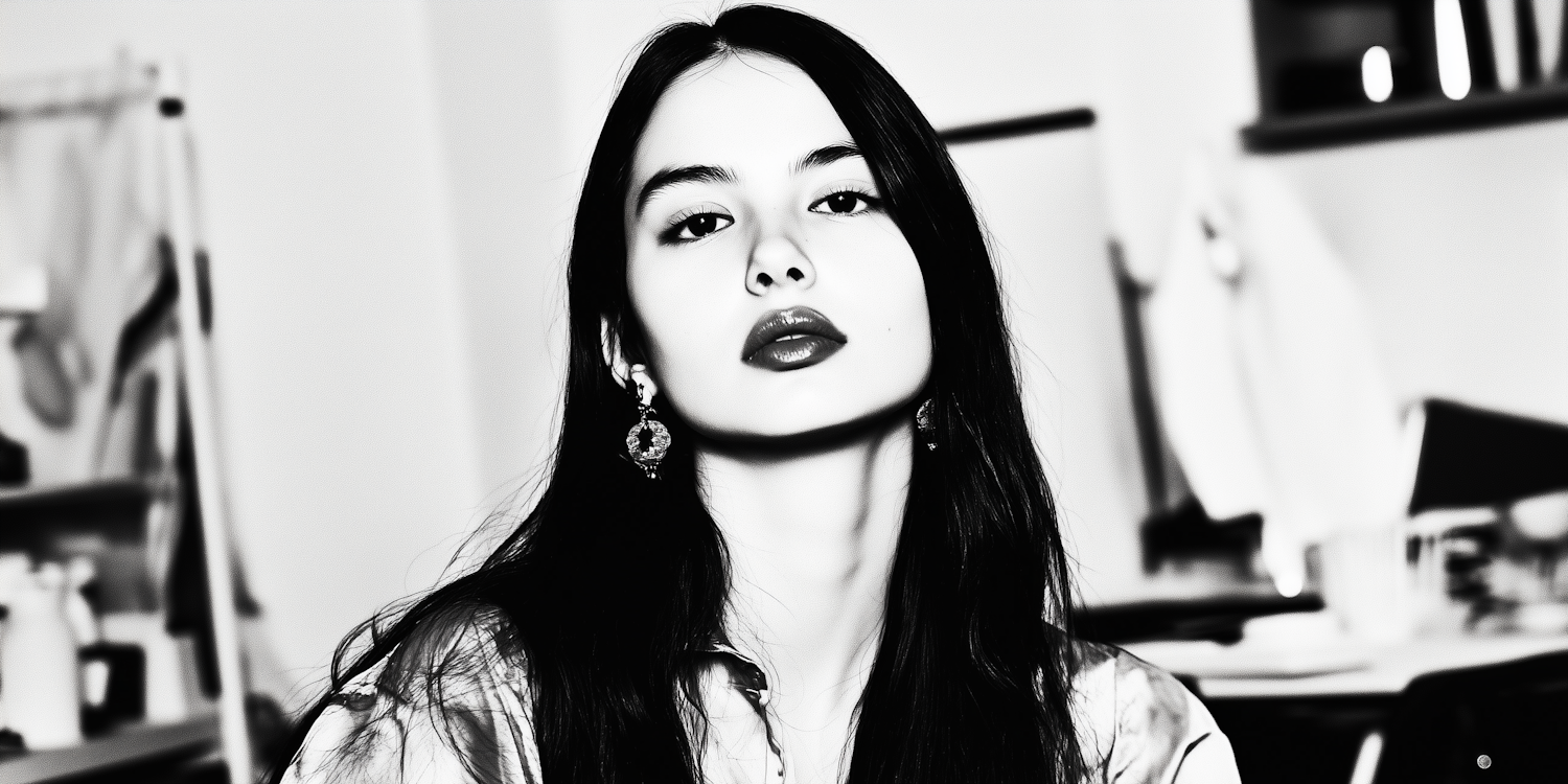Black-and-white portrait of a young woman with long hair, glossy lips, and statement earrings in an indoor setting.