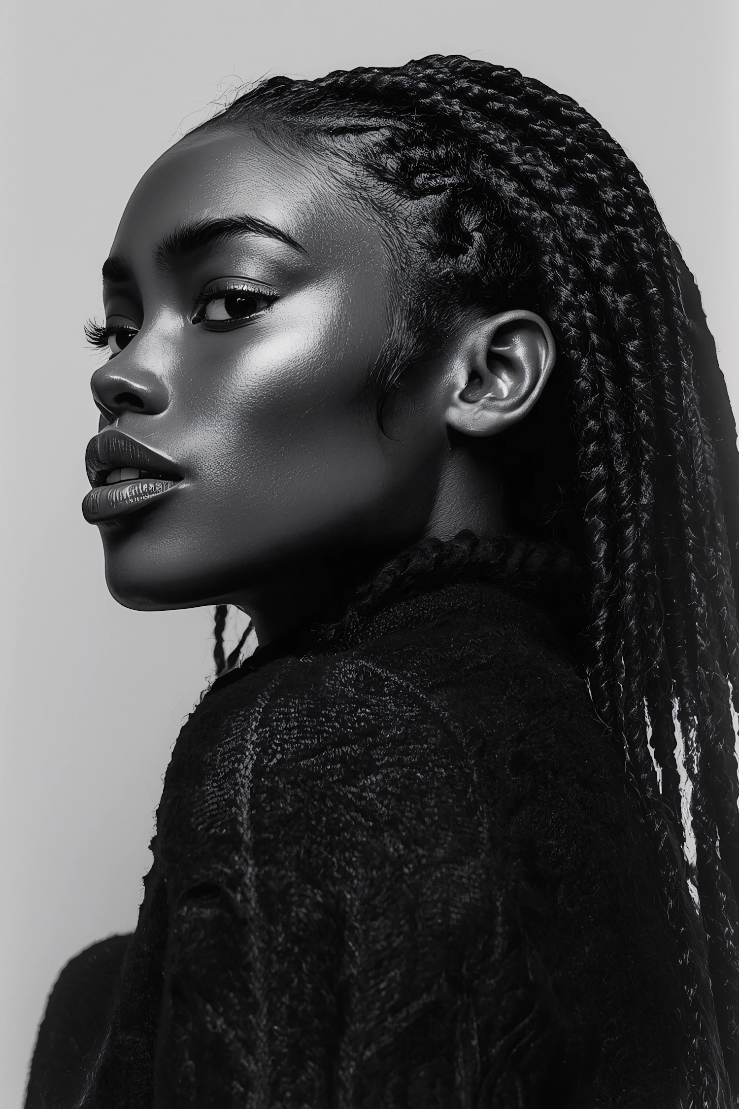 Black-and-white portrait of a woman with braided hair, showcasing her confident gaze and striking features in a minimalist setting.